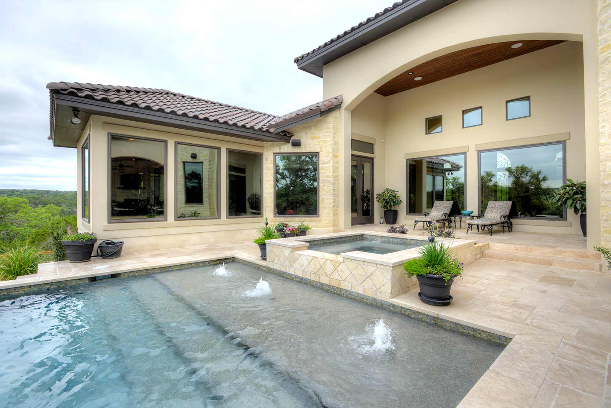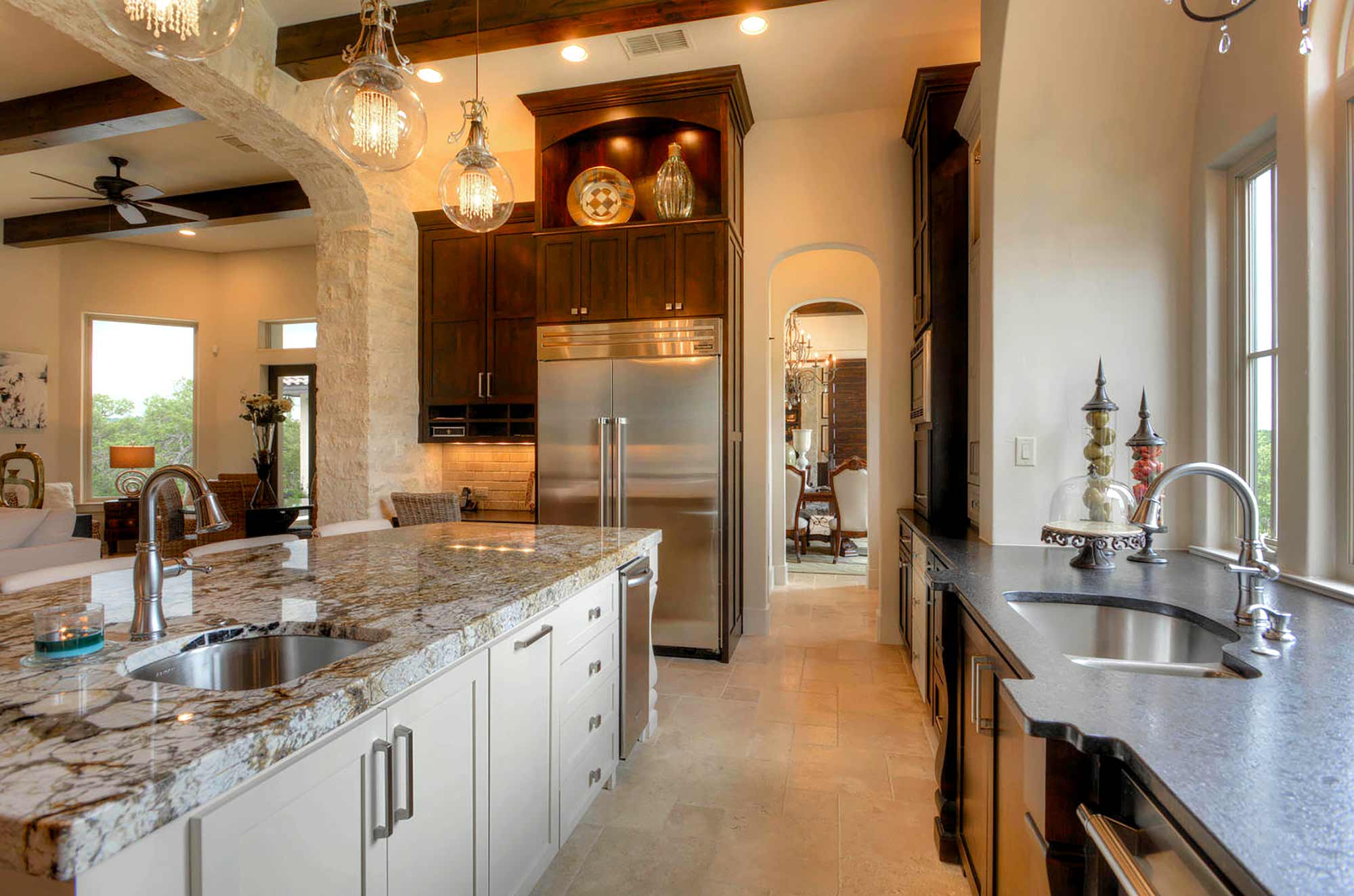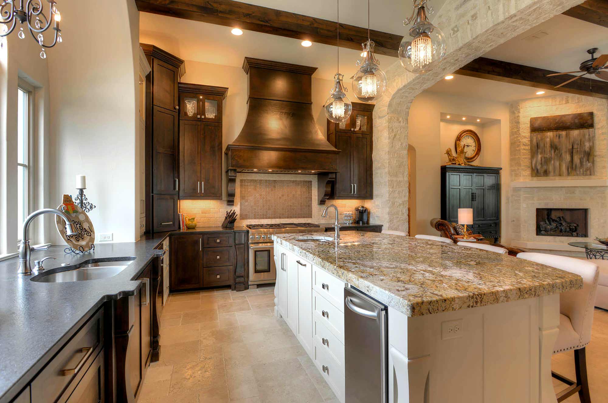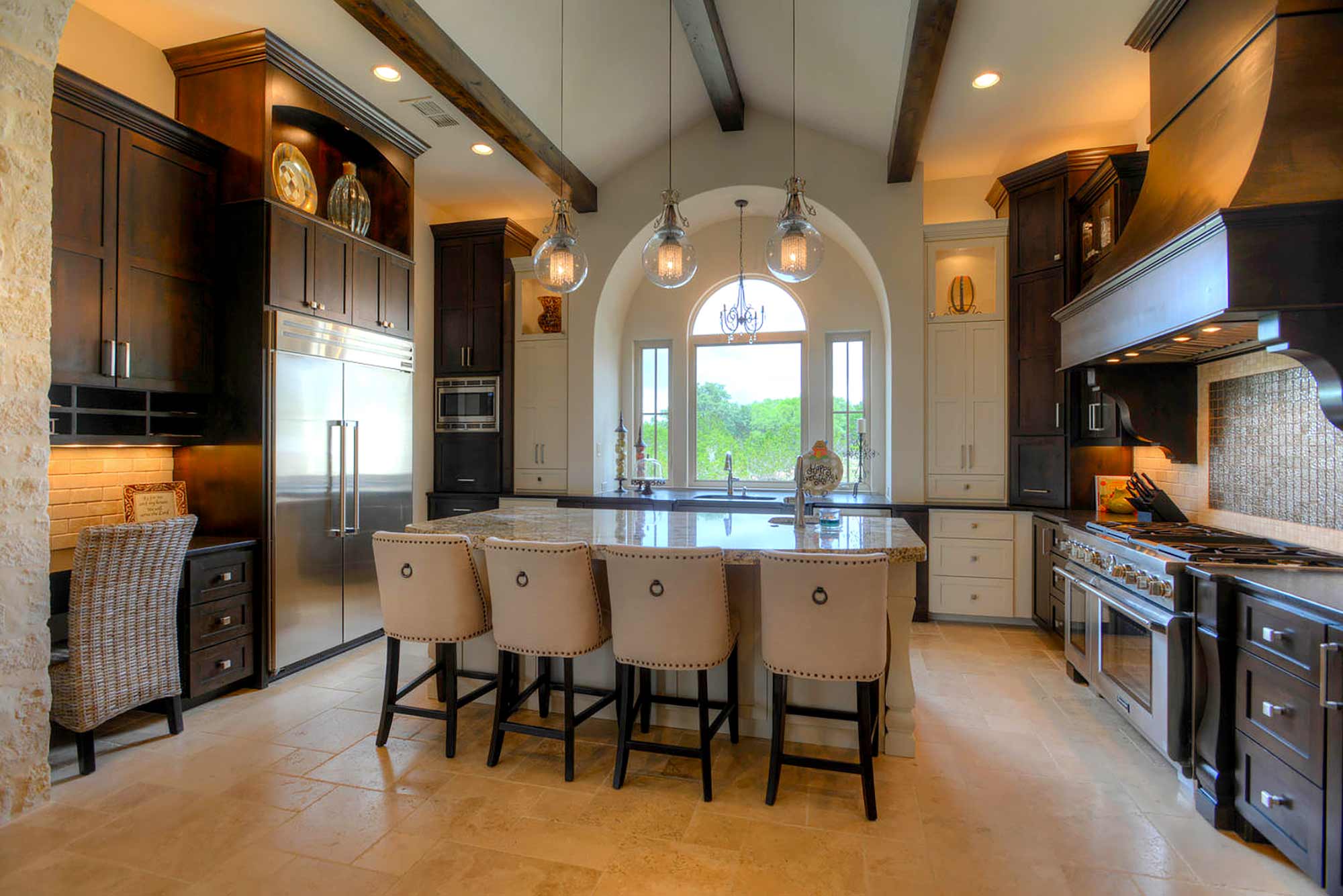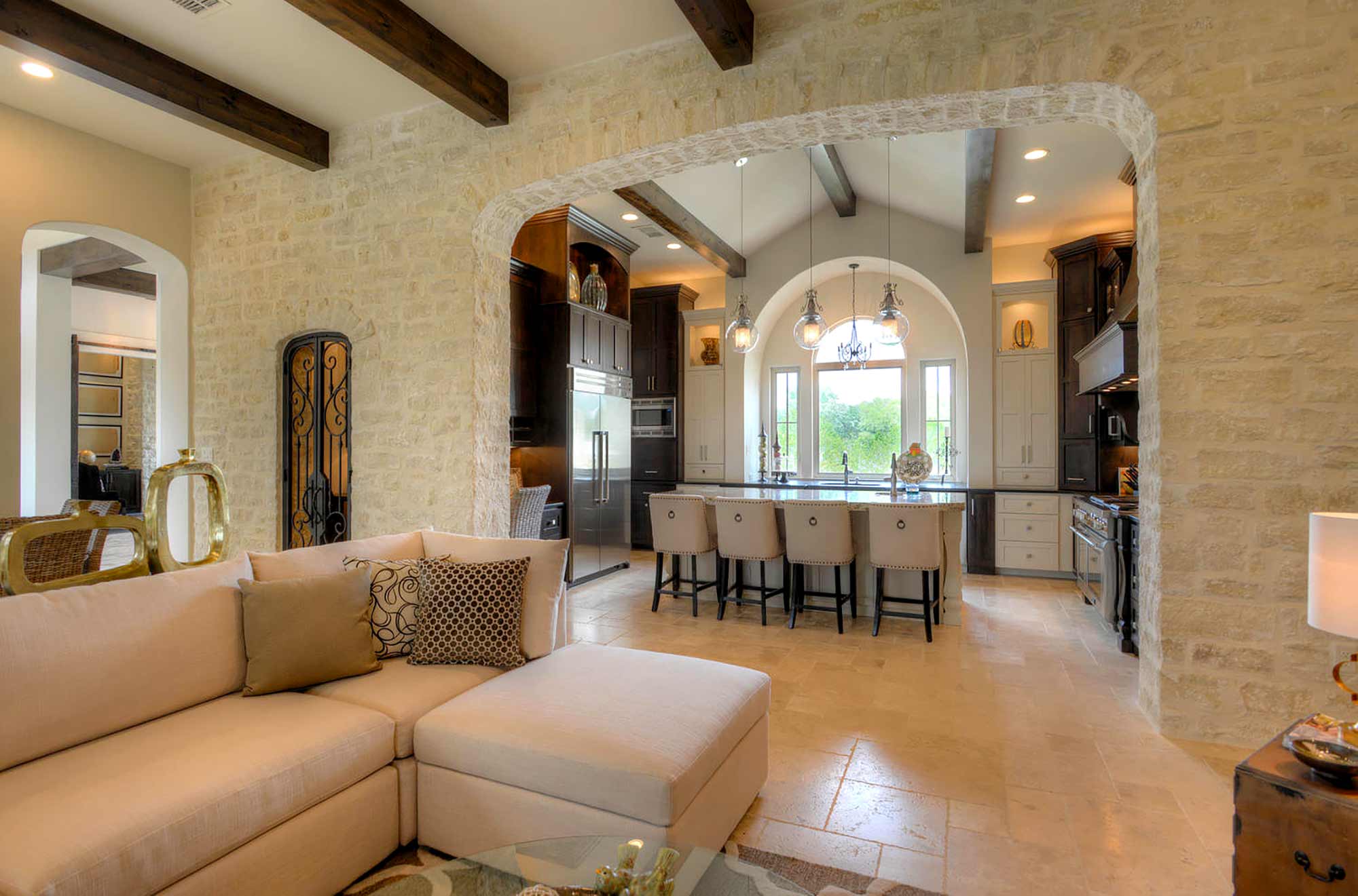 This elegant Hill Country home features a vaulted beamed ceiling entry that opens on a study with rich barn doors and wood built-ins, and a formal dining room with an impressive ceiling treatment. An open living area leads to a gourmet kitchen with stunning architectural details that include an imposing rock wall and archway, a beautiful archway over the windows and sink, a vaulted beamed ceiling and an impressive wood vent hood...