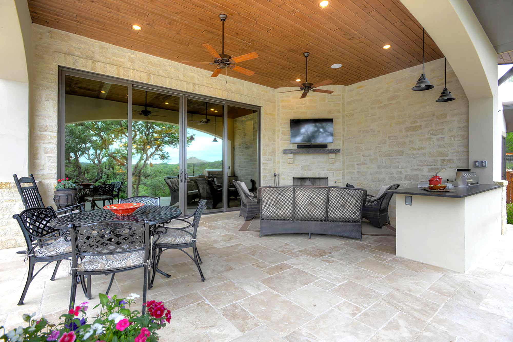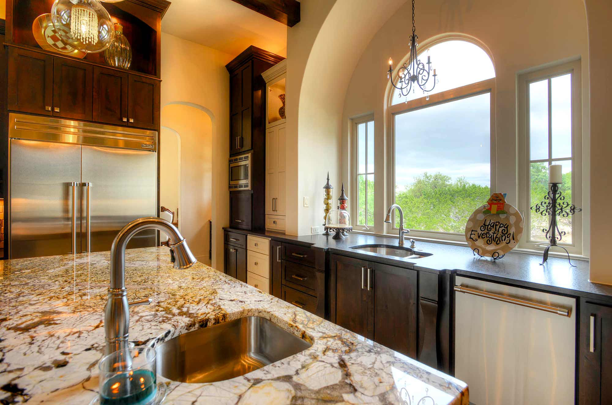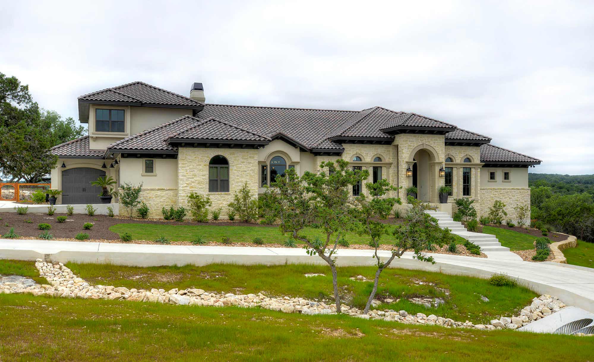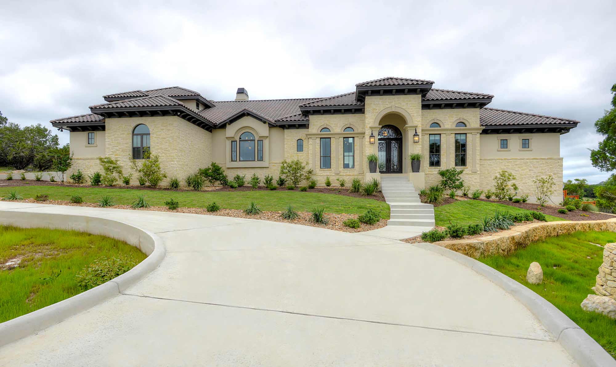 This elegant Hill Country home features a vaulted beamed ceiling entry that opens on a study with rich barn doors and wood built-ins, and a formal dining room with an impressive ceiling treatment. An open living area leads to a gourmet kitchen with stunning architectural details that include an imposing rock wall and archway, a beautiful archway over the windows and sink, a vaulted beamed ceiling and an impressive wood vent hood...