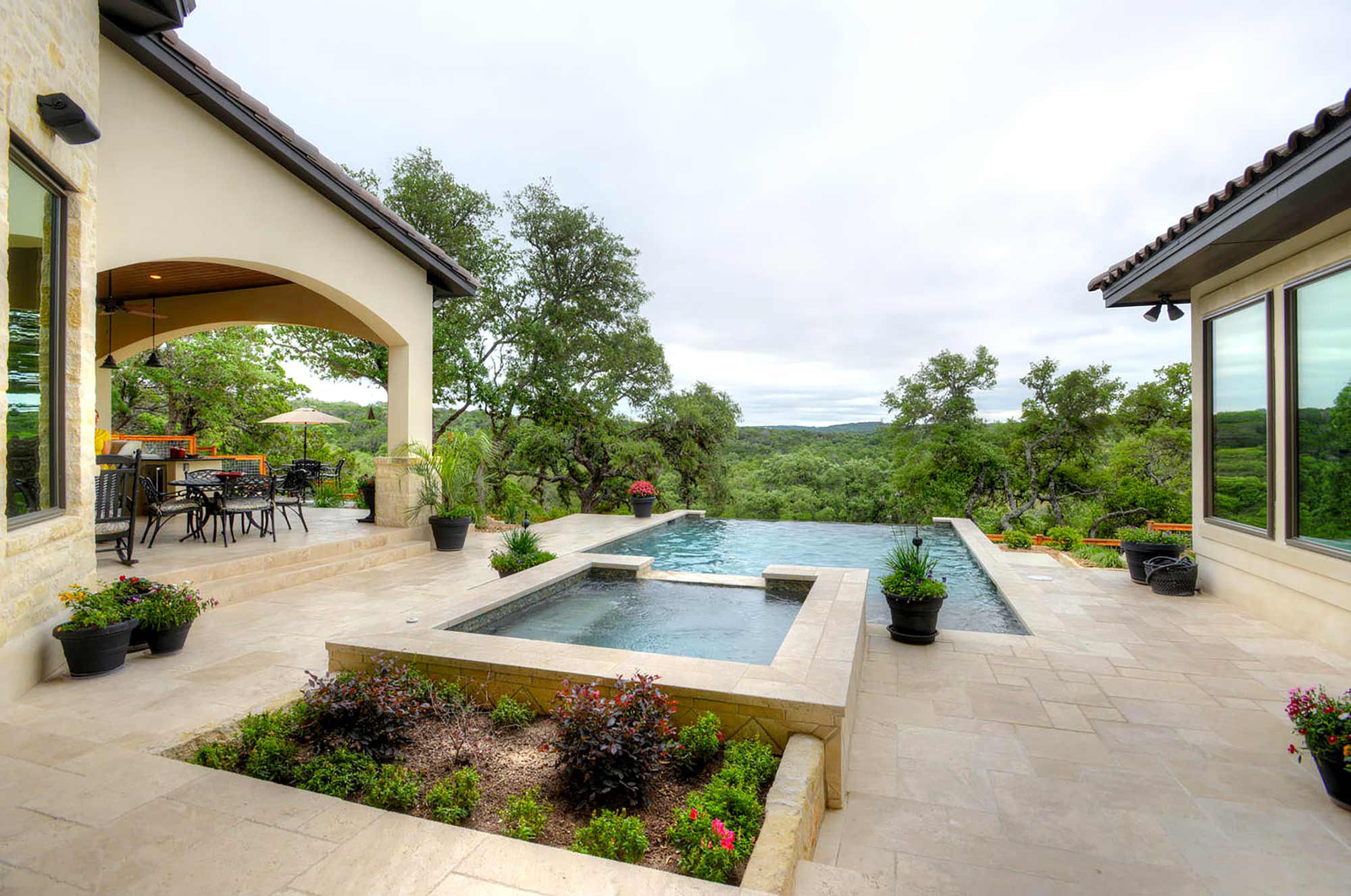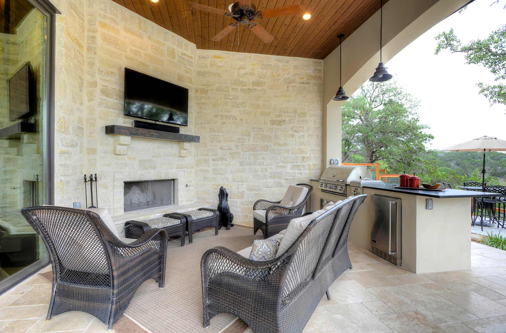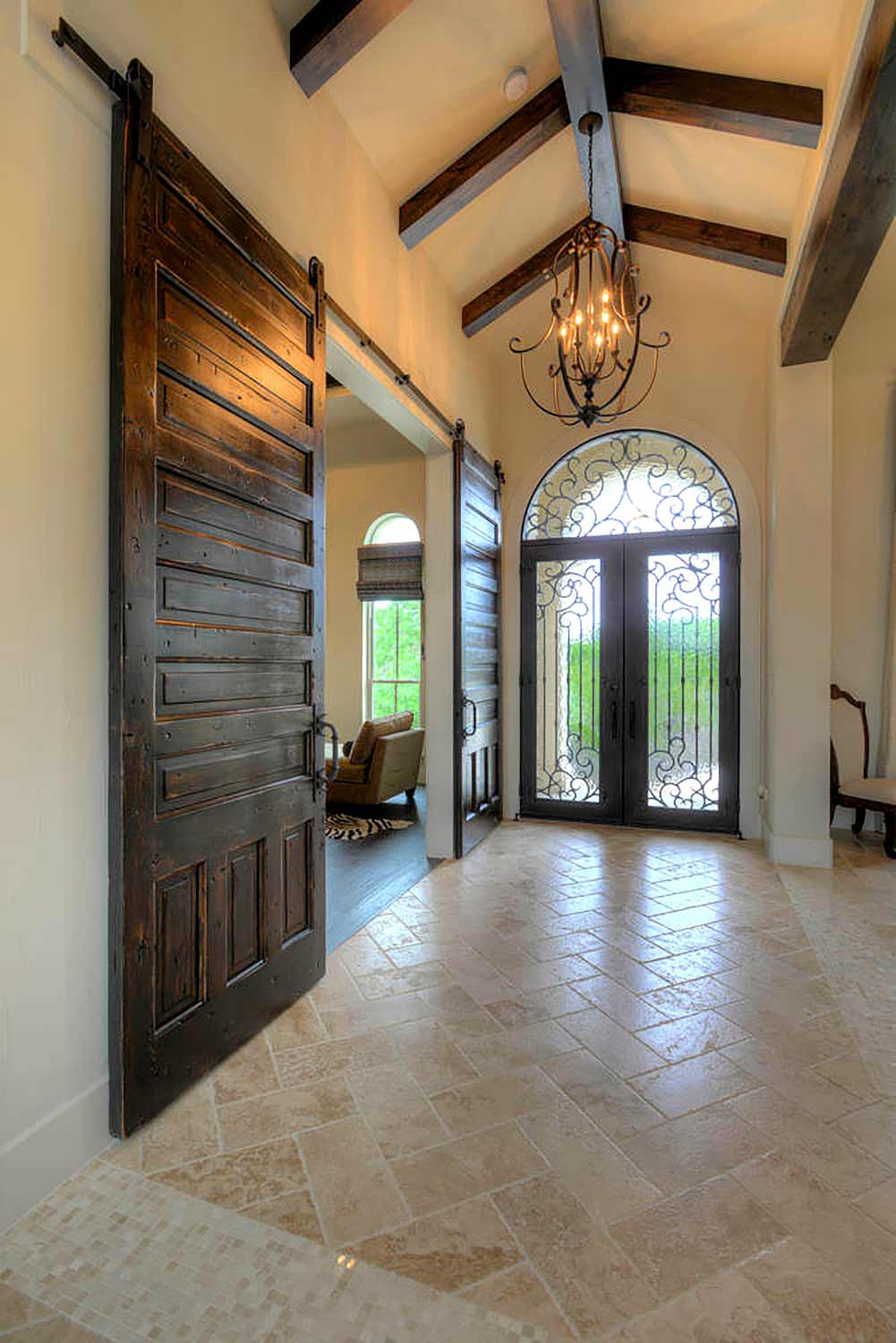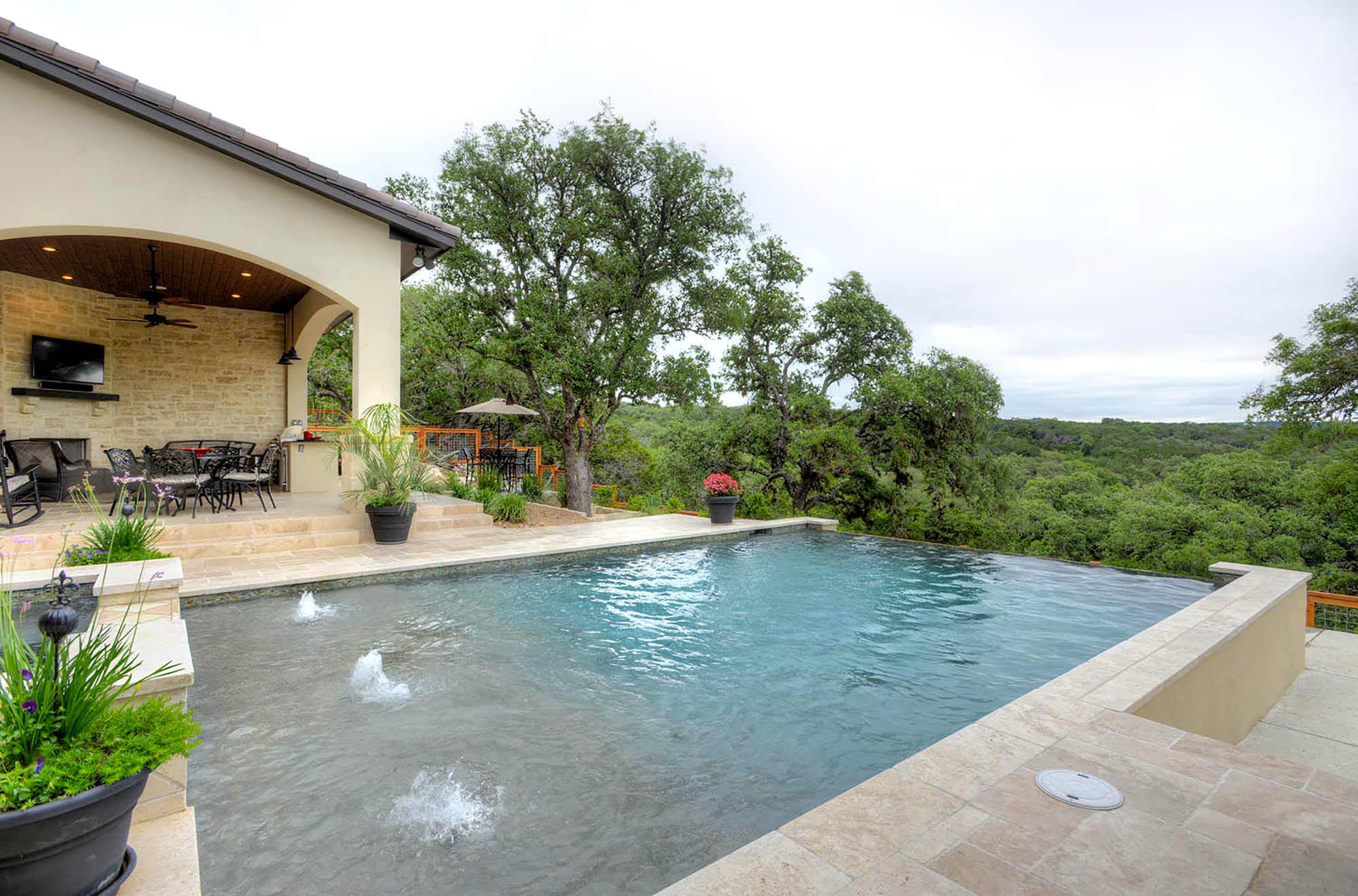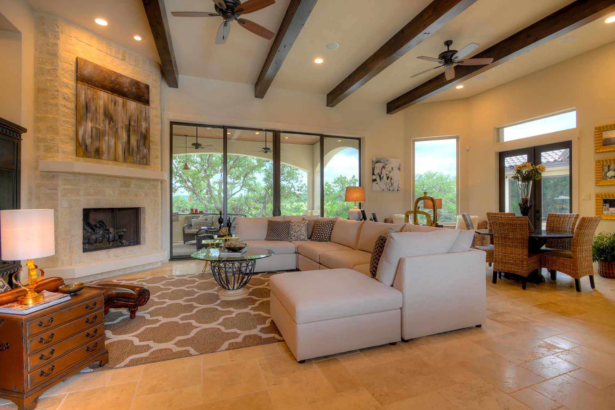This elegant Hill Country home features a vaulted beamed ceiling entry that opens on a study with rich barn doors and wood built-ins, and a formal dining room with an impressive ceiling treatment. An open living area leads to a gourmet kitchen with stunning architectural details that include an imposing rock wall and archway, a beautiful archway over the windows and sink, a vaulted beamed ceiling and an impressive wood vent hood...