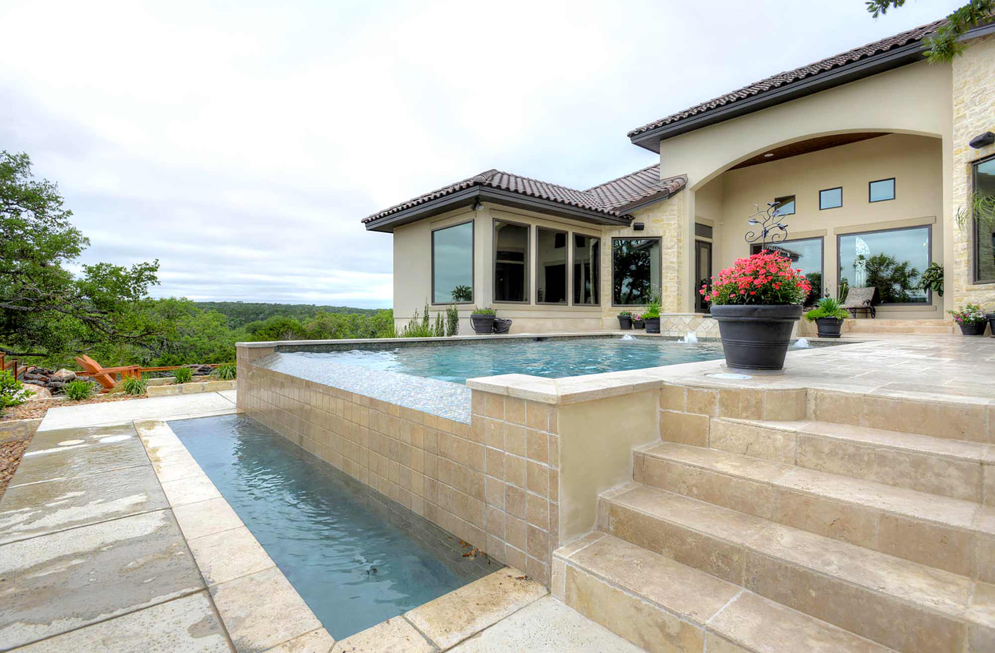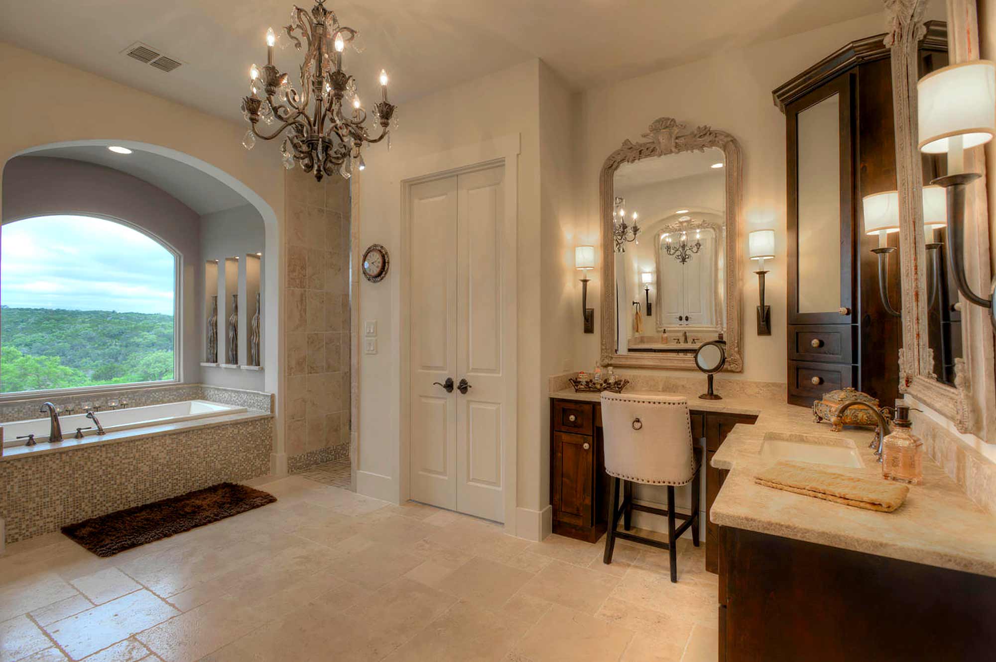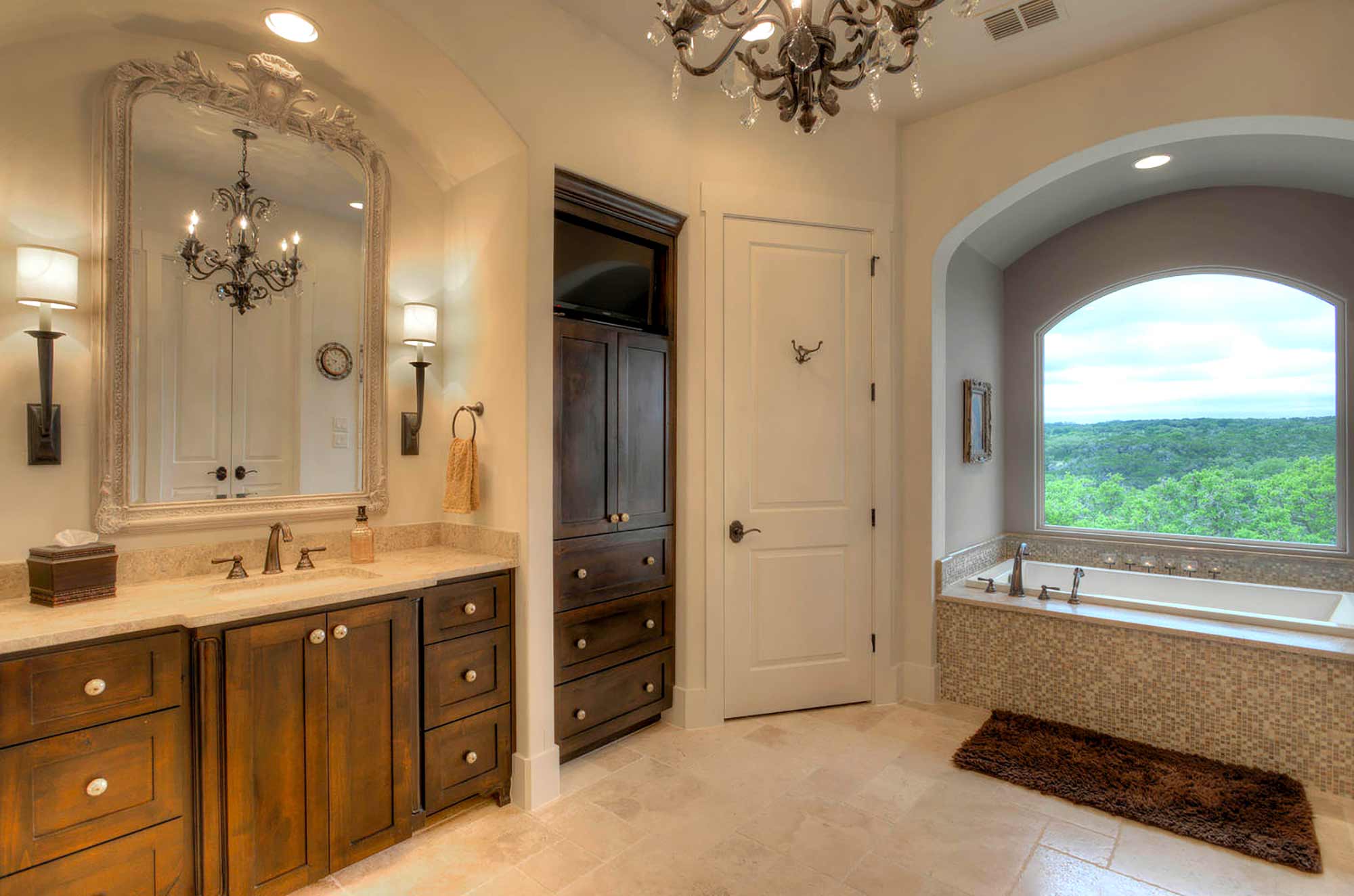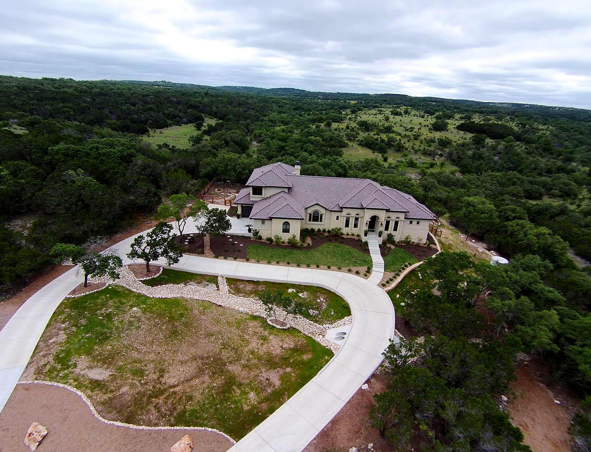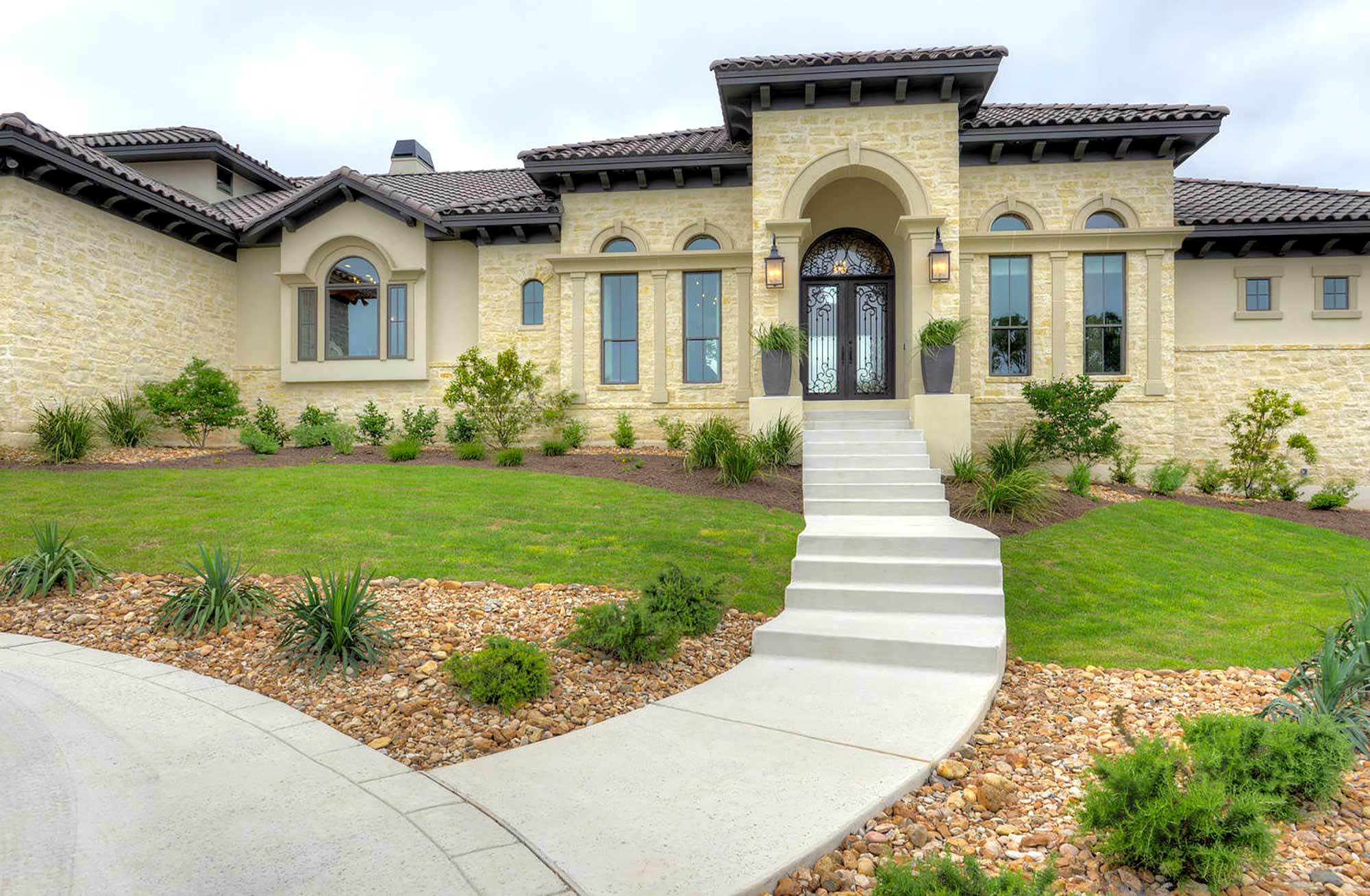 This elegant Hill Country home features a vaulted beamed ceiling entry that opens on a study with rich barn doors and wood built-ins, and a formal dining room with an impressive ceiling treatment. An open living area leads to a gourmet kitchen with stunning architectural details that include an imposing rock wall and archway, a beautiful archway over the windows and sink, a vaulted beamed ceiling and an impressive wood vent hood...