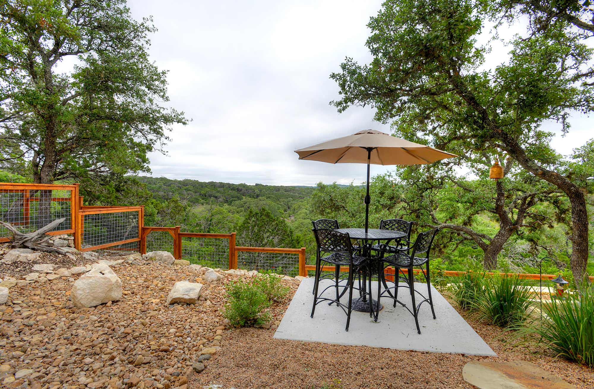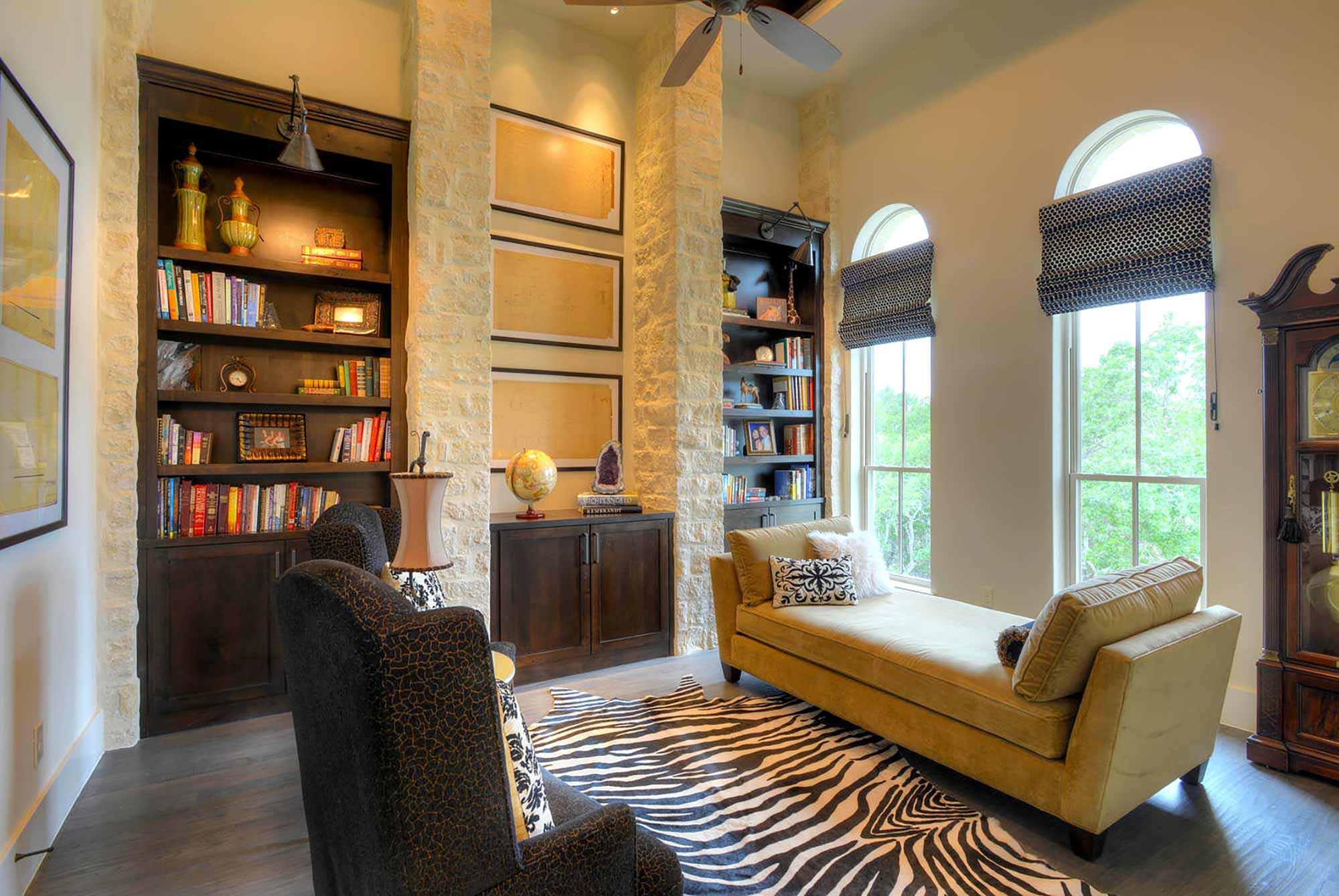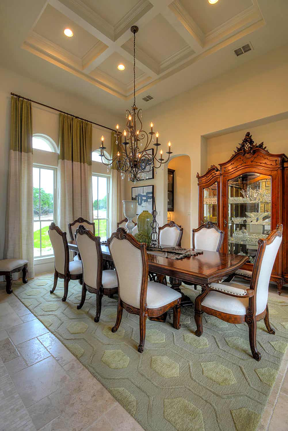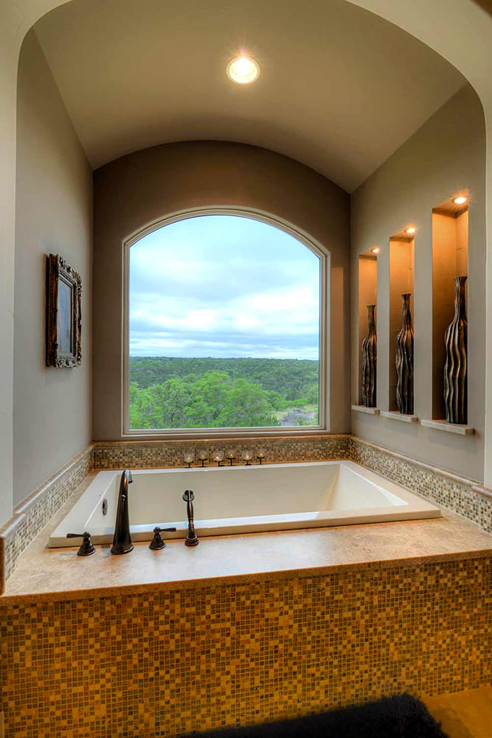 This elegant Hill Country home features a vaulted beamed ceiling entry that opens on a study with rich barn doors and wood built-ins, and a formal dining room with an impressive ceiling treatment. An open living area leads to a gourmet kitchen with stunning architectural details that include an imposing rock wall and archway, a beautiful archway over the windows and sink, a vaulted beamed ceiling and an impressive wood vent hood...