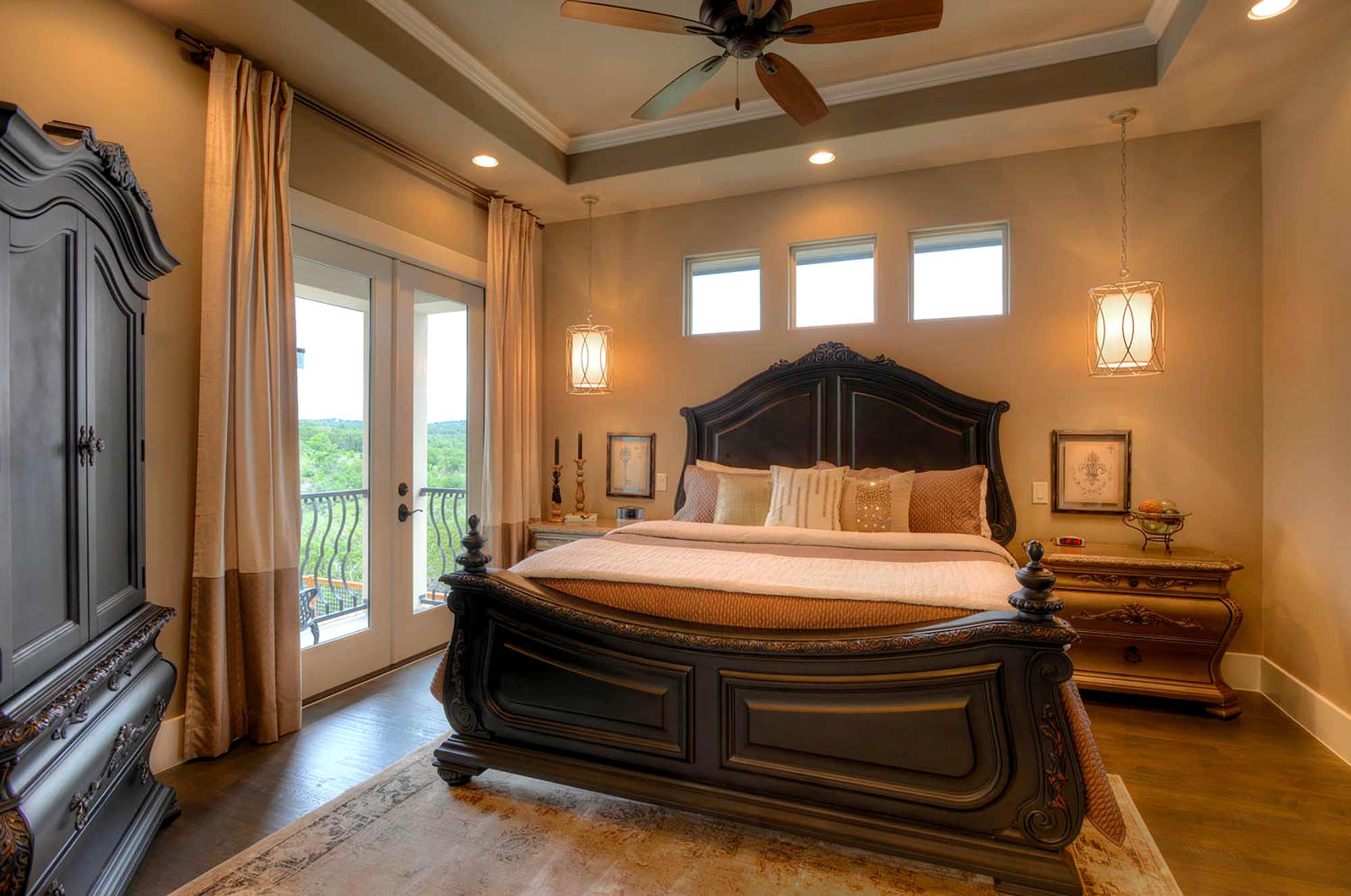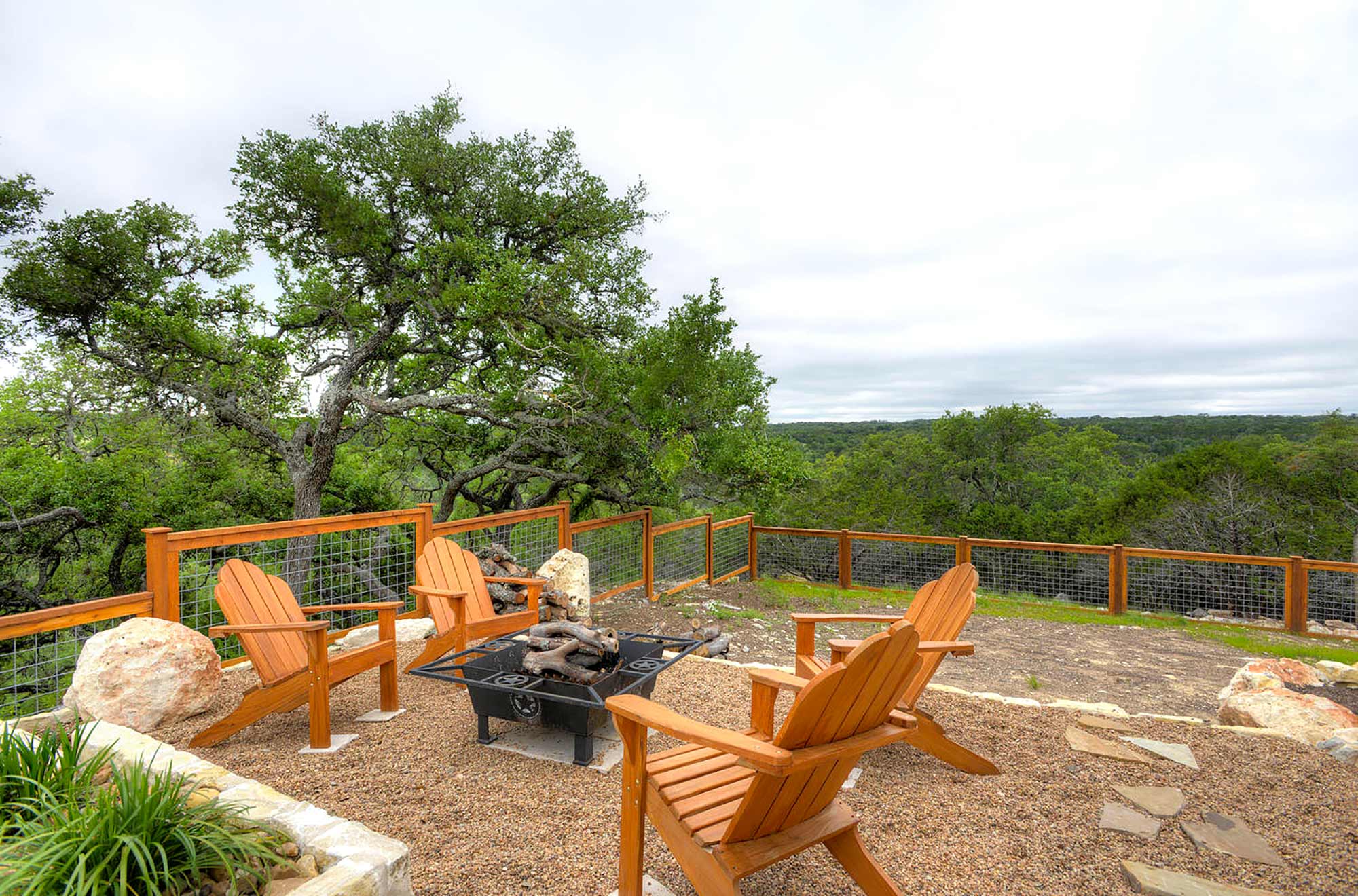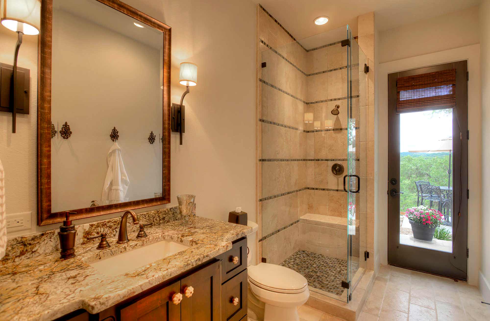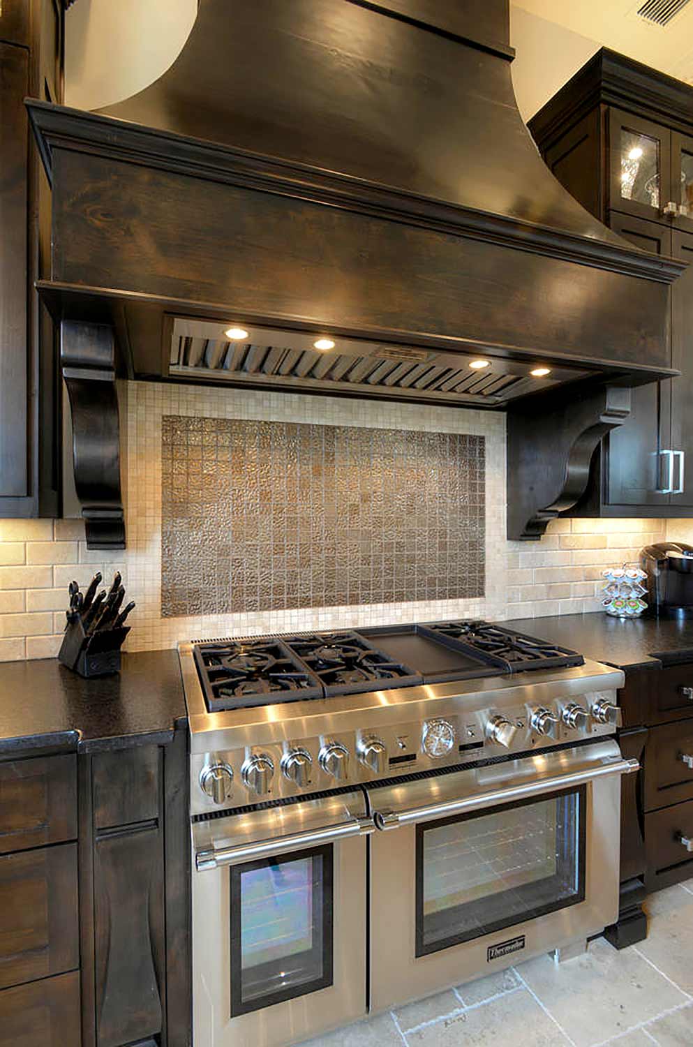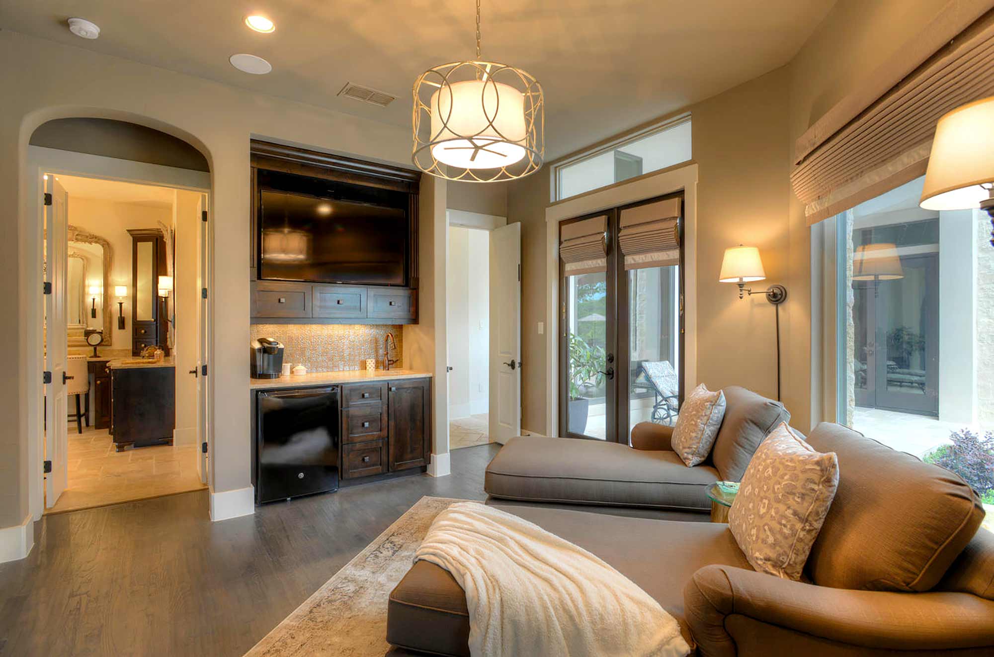 This elegant Hill Country home features a vaulted beamed ceiling entry that opens on a study with rich barn doors and wood built-ins, and a formal dining room with an impressive ceiling treatment. An open living area leads to a gourmet kitchen with stunning architectural details that include an imposing rock wall and archway, a beautiful archway over the windows and sink, a vaulted beamed ceiling and an impressive wood vent hood...