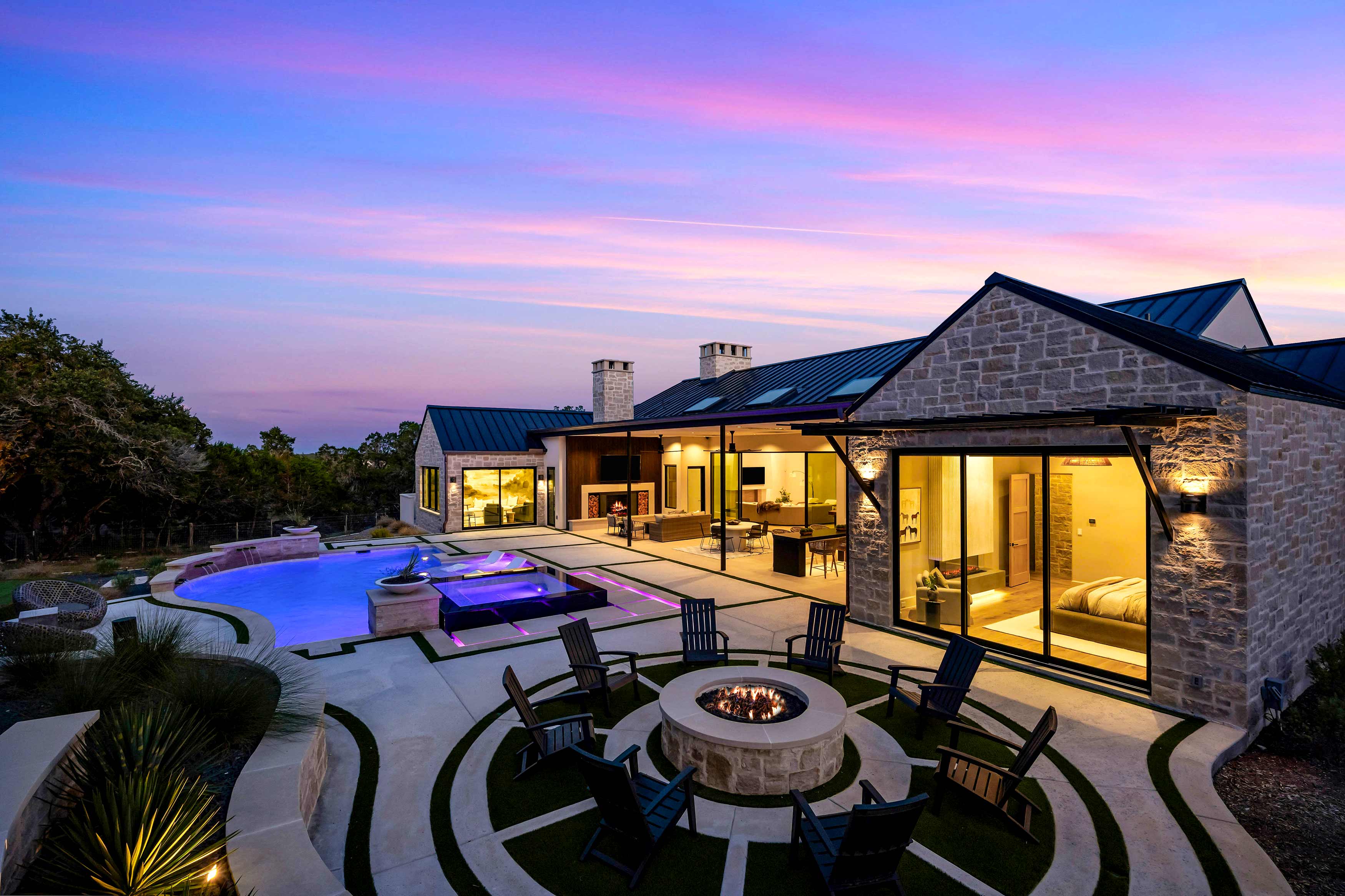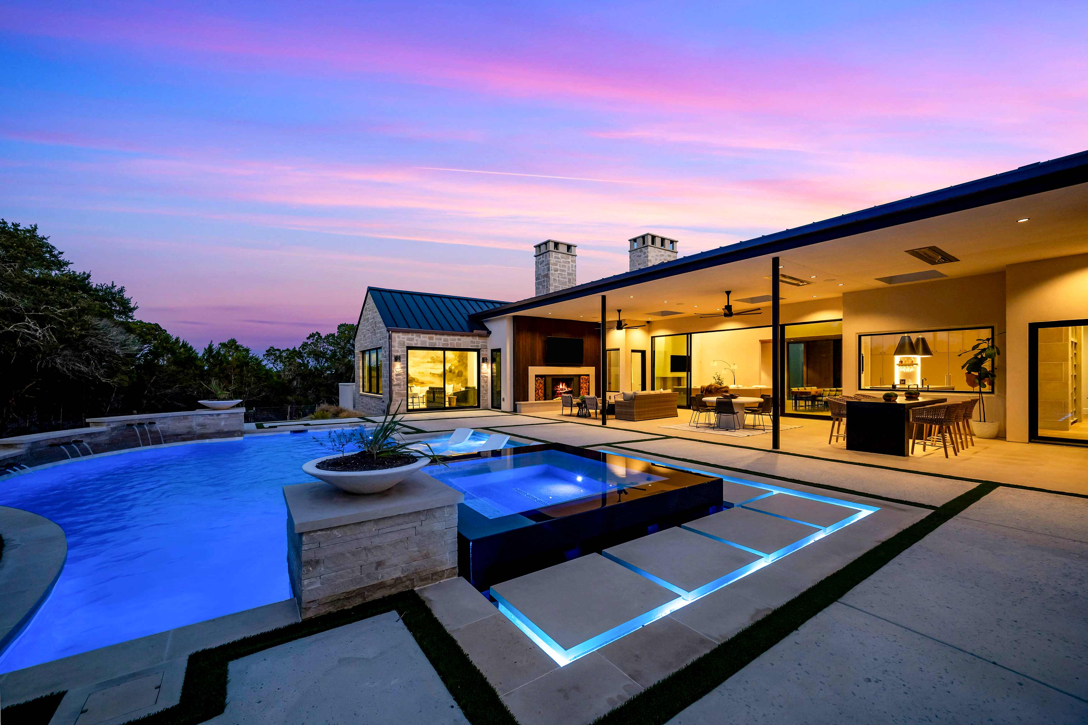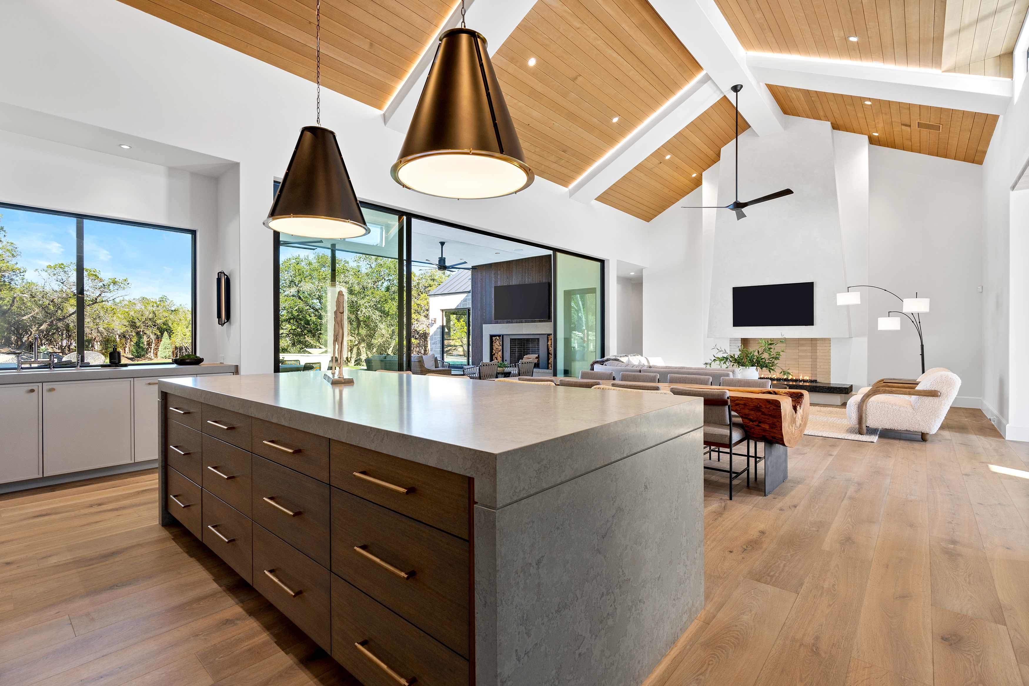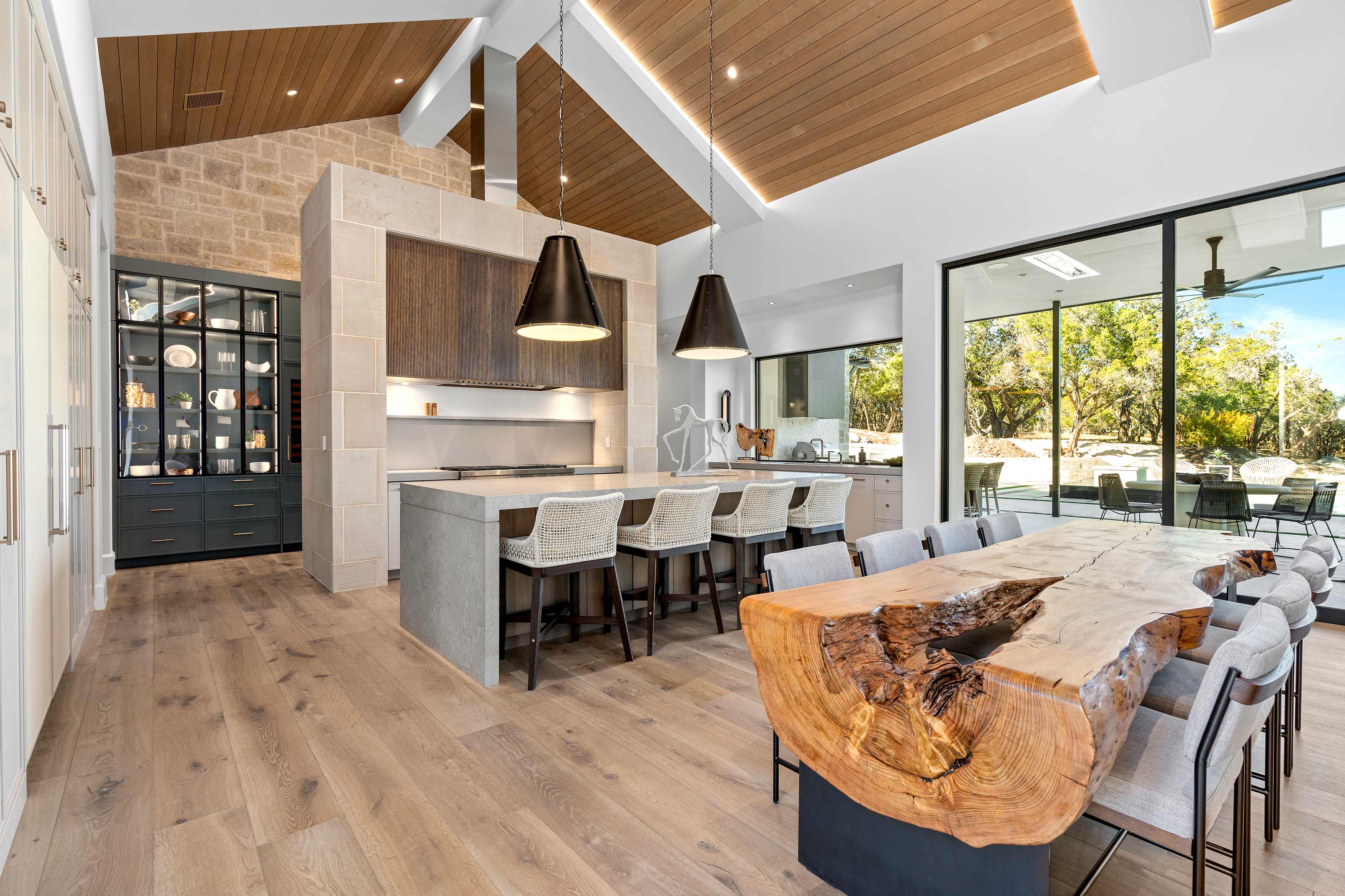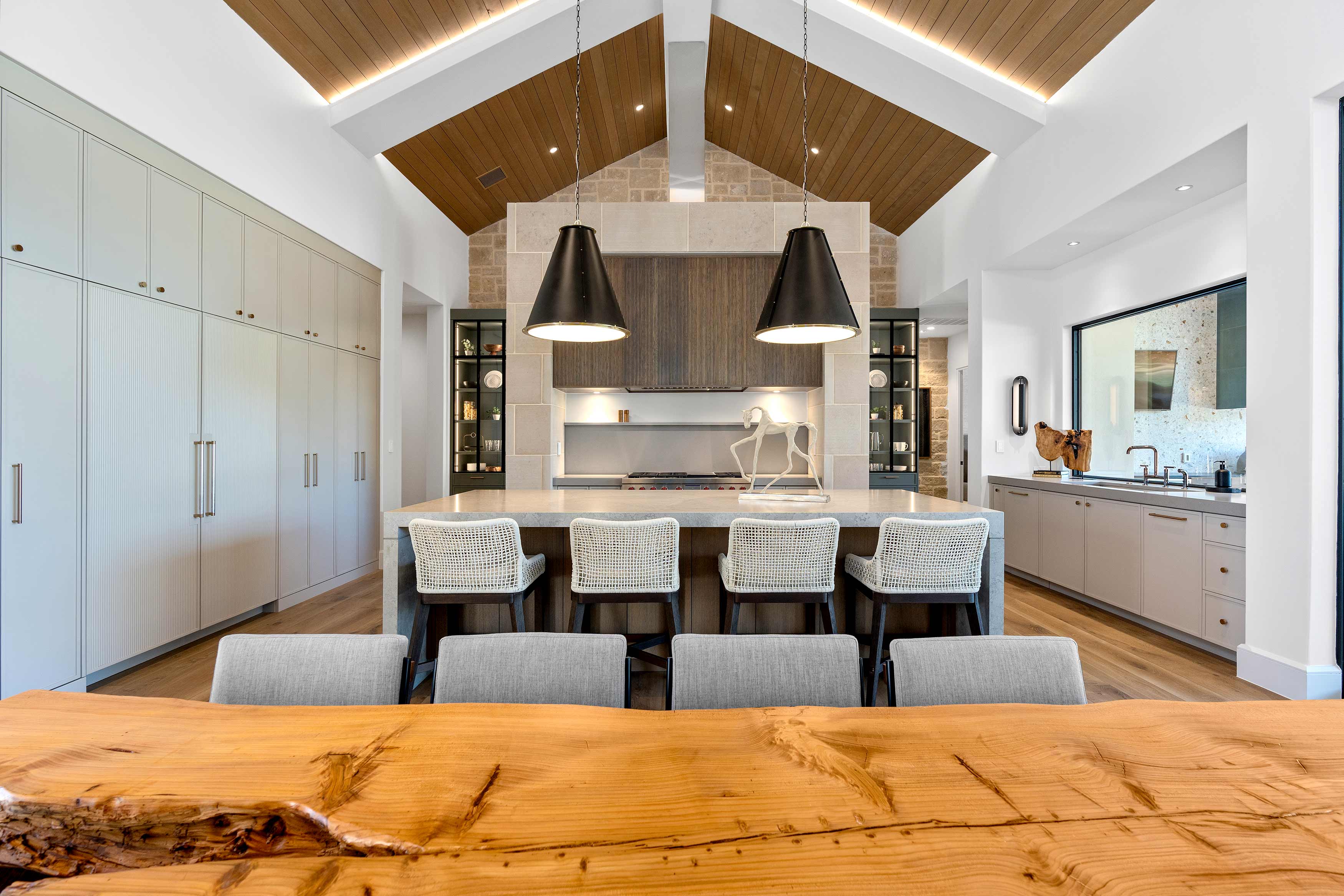 This custom Hill Country Modern home showcases modern elegance with organic warmth, defined by thoughtful craftsmanship and hidden functionality. Vaulted and coffered ceilings, integrated LED lighting and rich oak floors create a seamless flow through spaces designed for everyday comfort and sophisticated entertaining. Warm mushroom-toned cabinetry, hemlock planked ceilings and layered textures bring a sense of calm while sculptural light fixtures and contemporary finishes introduce a refined edge.