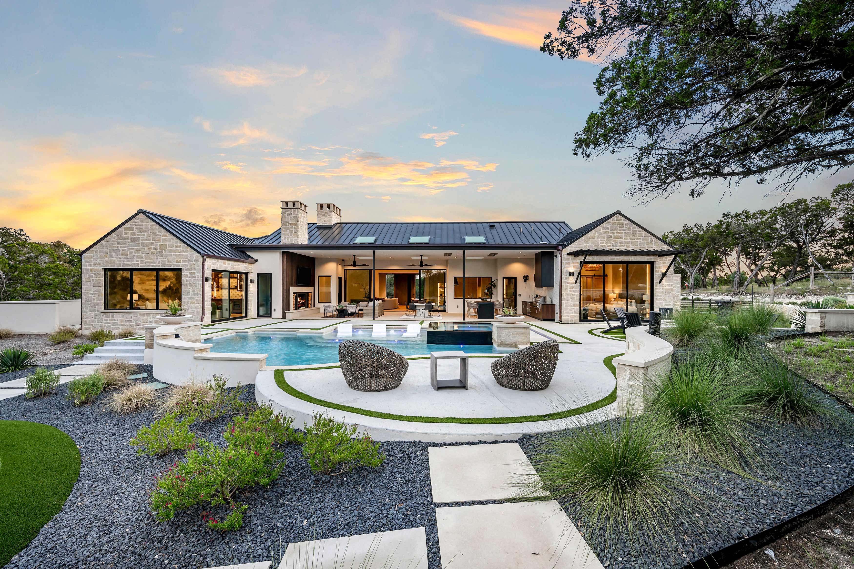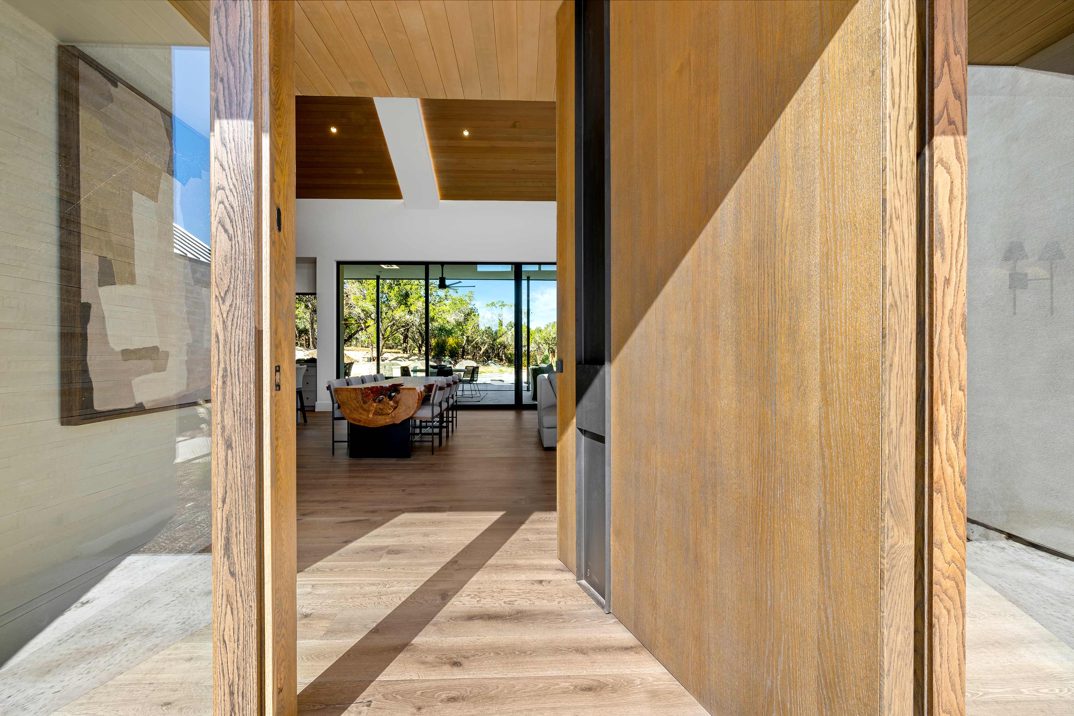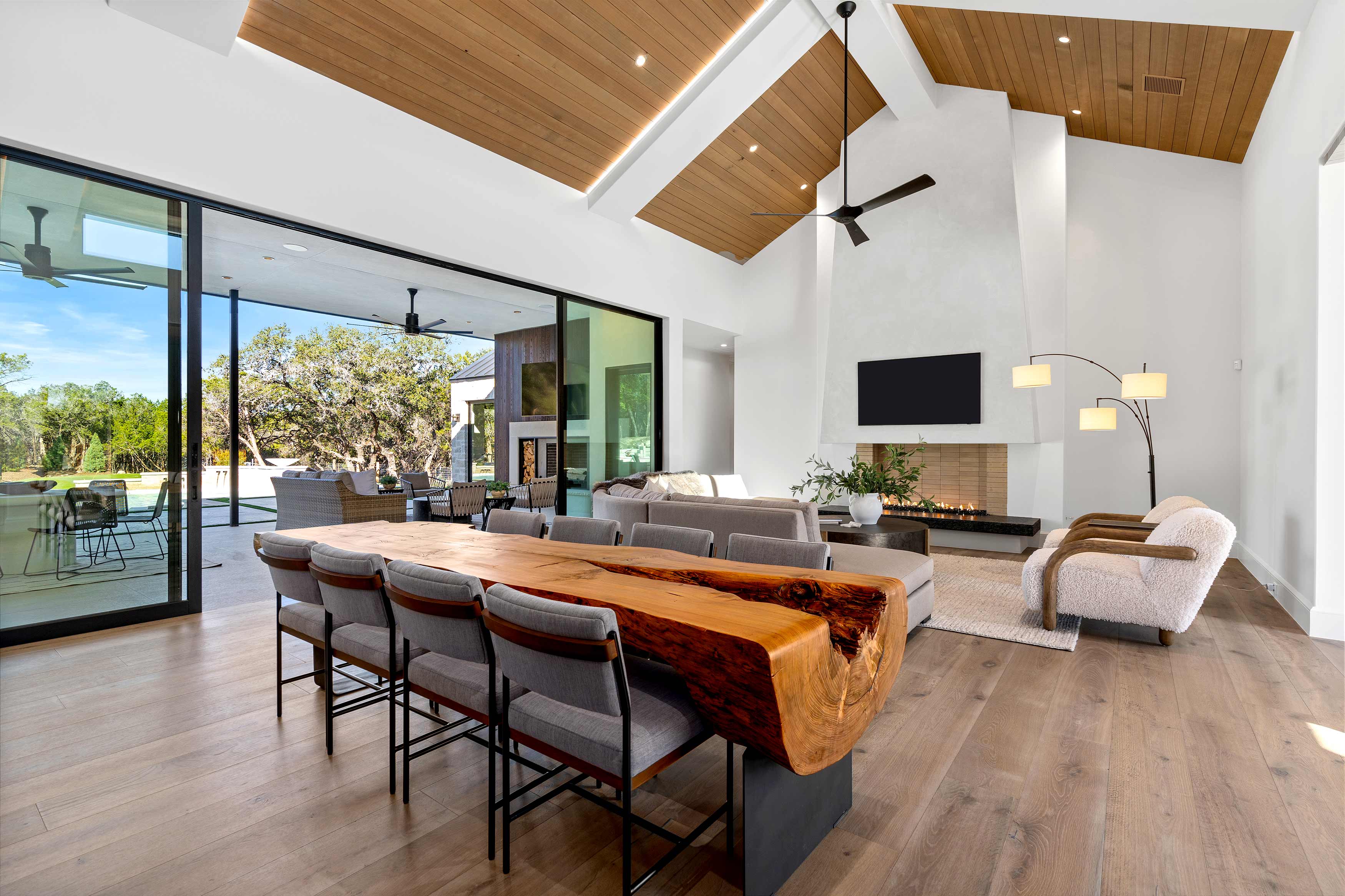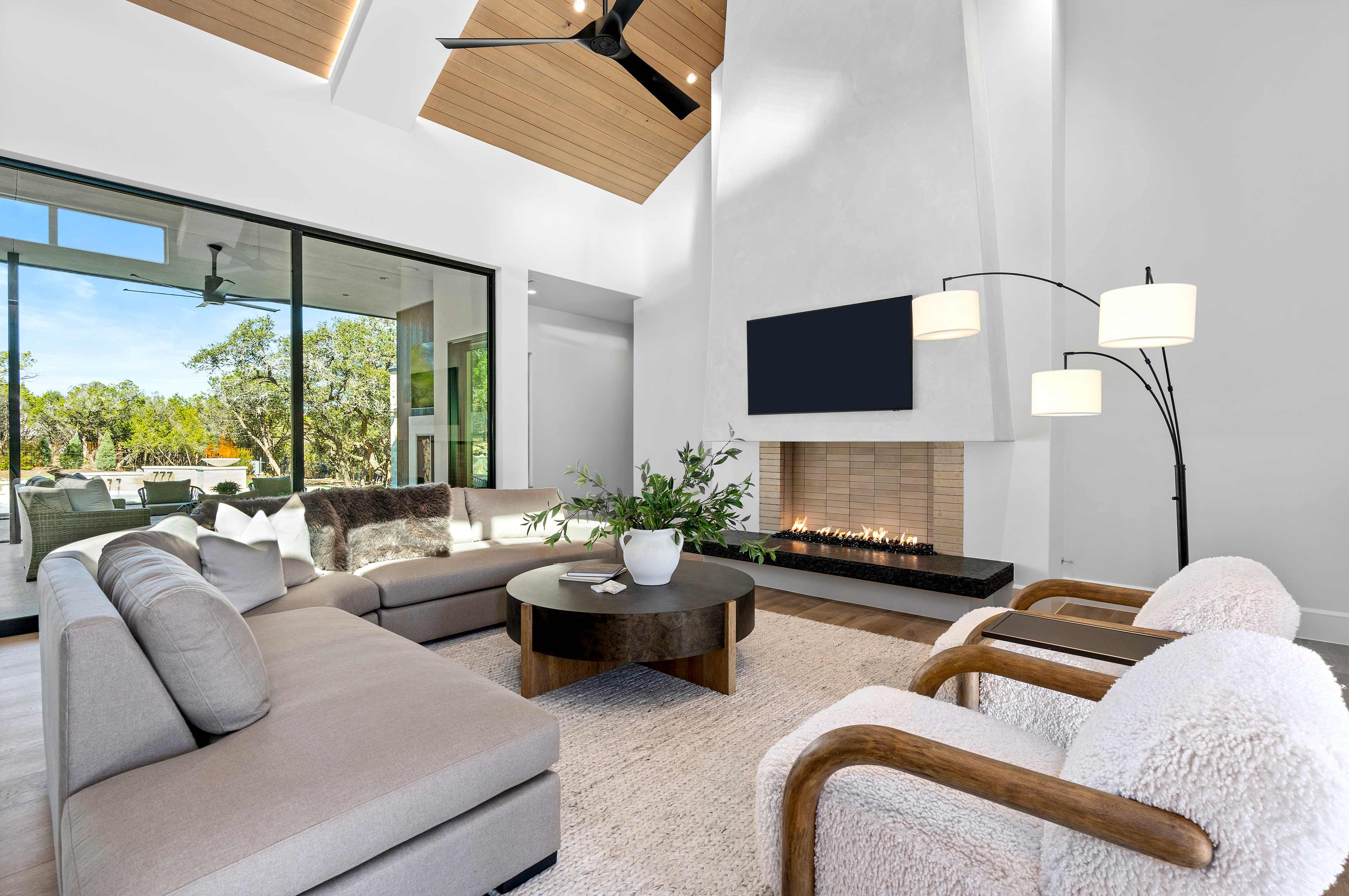 This custom Hill Country Modern home showcases modern elegance with organic warmth, defined by thoughtful craftsmanship and hidden functionality. Vaulted and coffered ceilings, integrated LED lighting and rich oak floors create a seamless flow through spaces designed for everyday comfort and sophisticated entertaining. Warm mushroom-toned cabinetry, hemlock planked ceilings and layered textures bring a sense of calm while sculptural light fixtures and contemporary finishes introduce a refined edge.