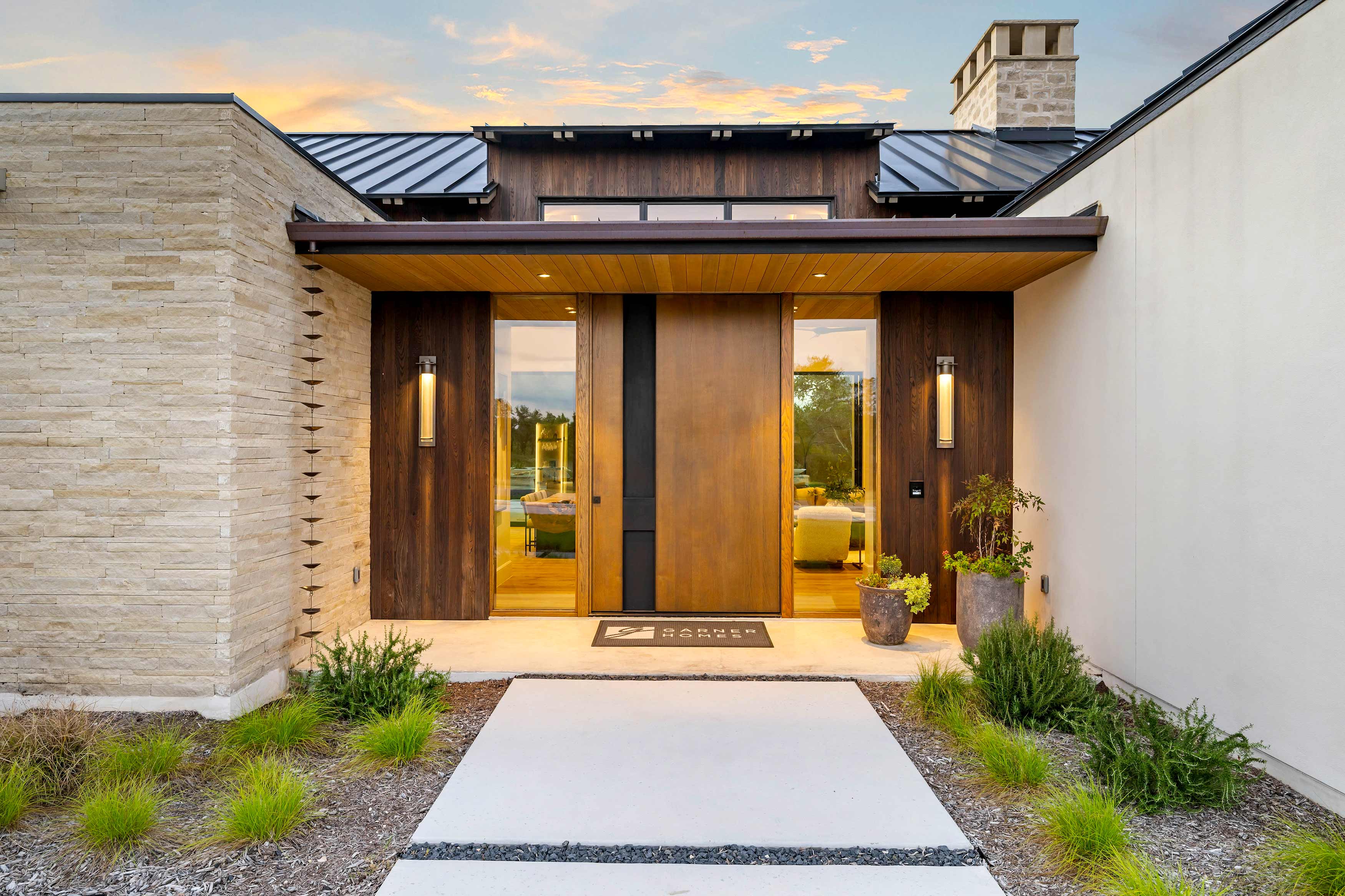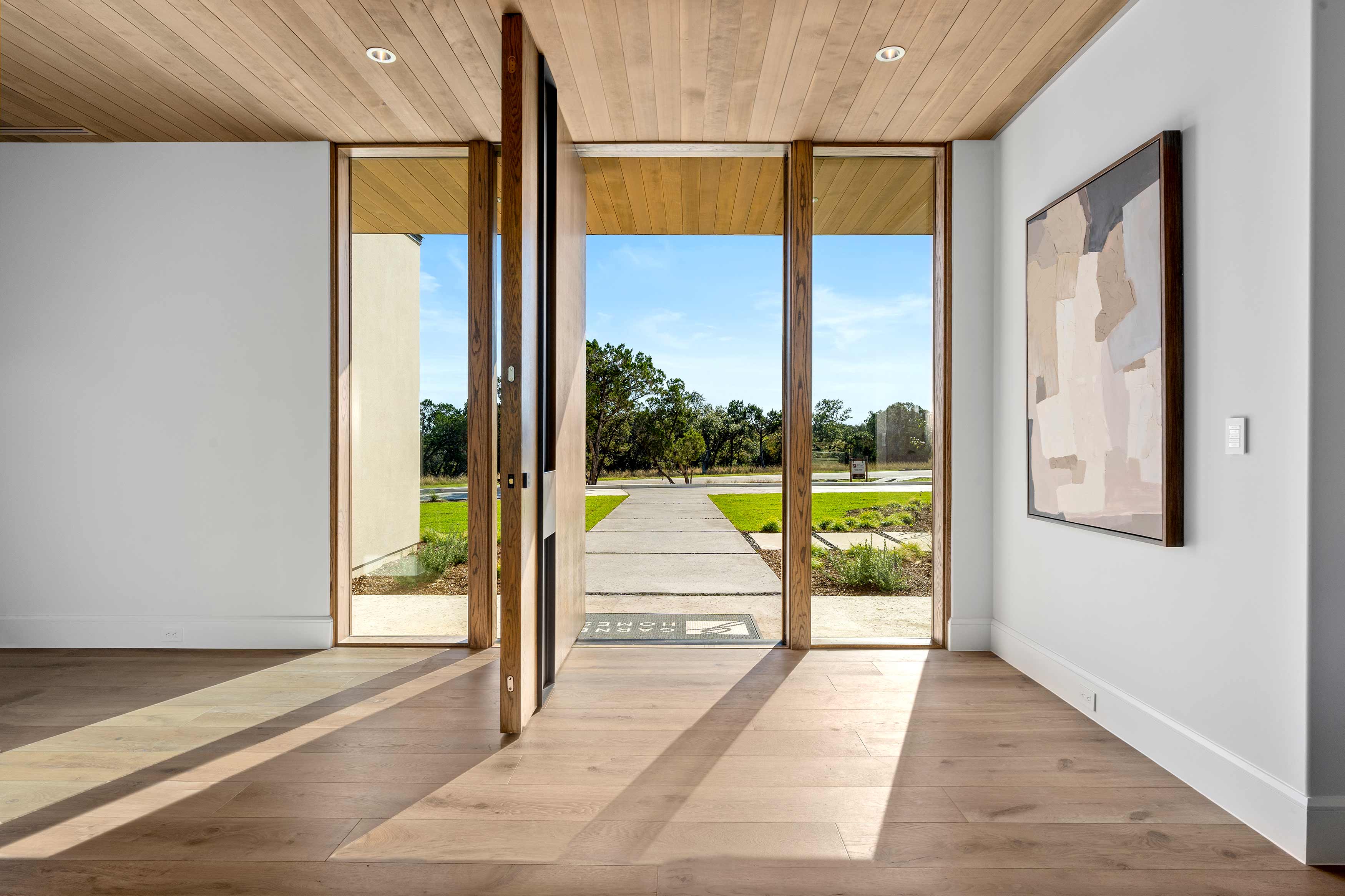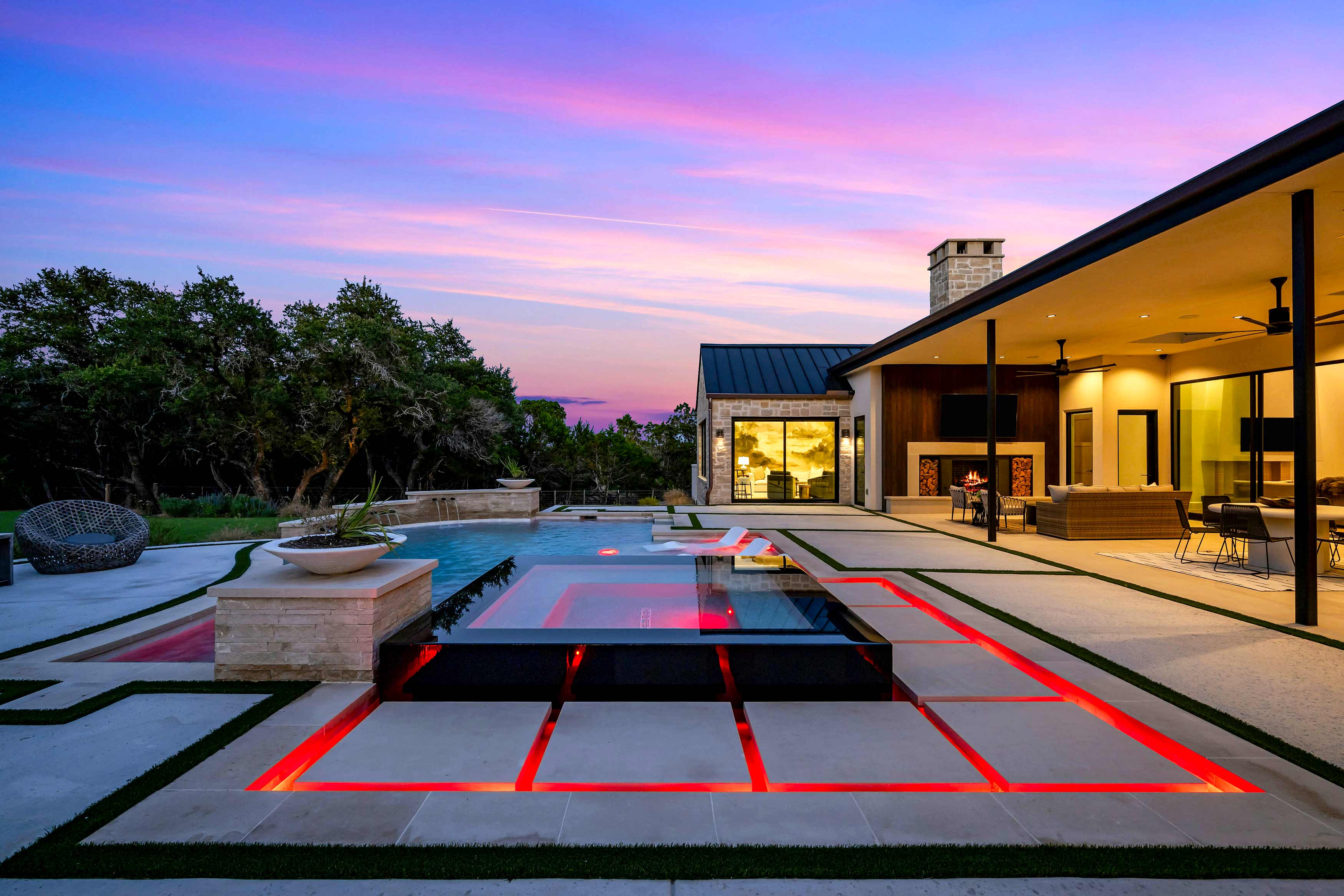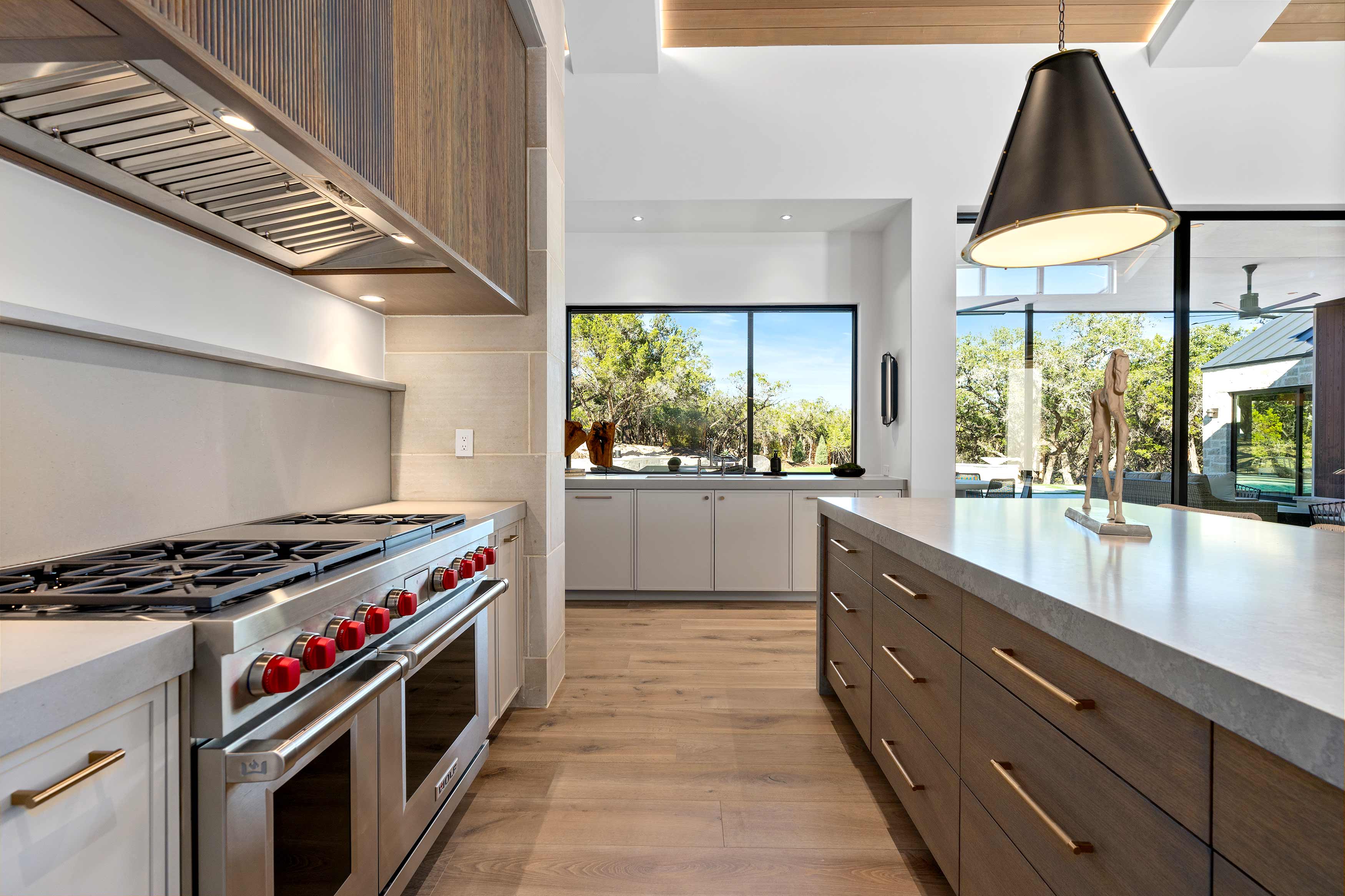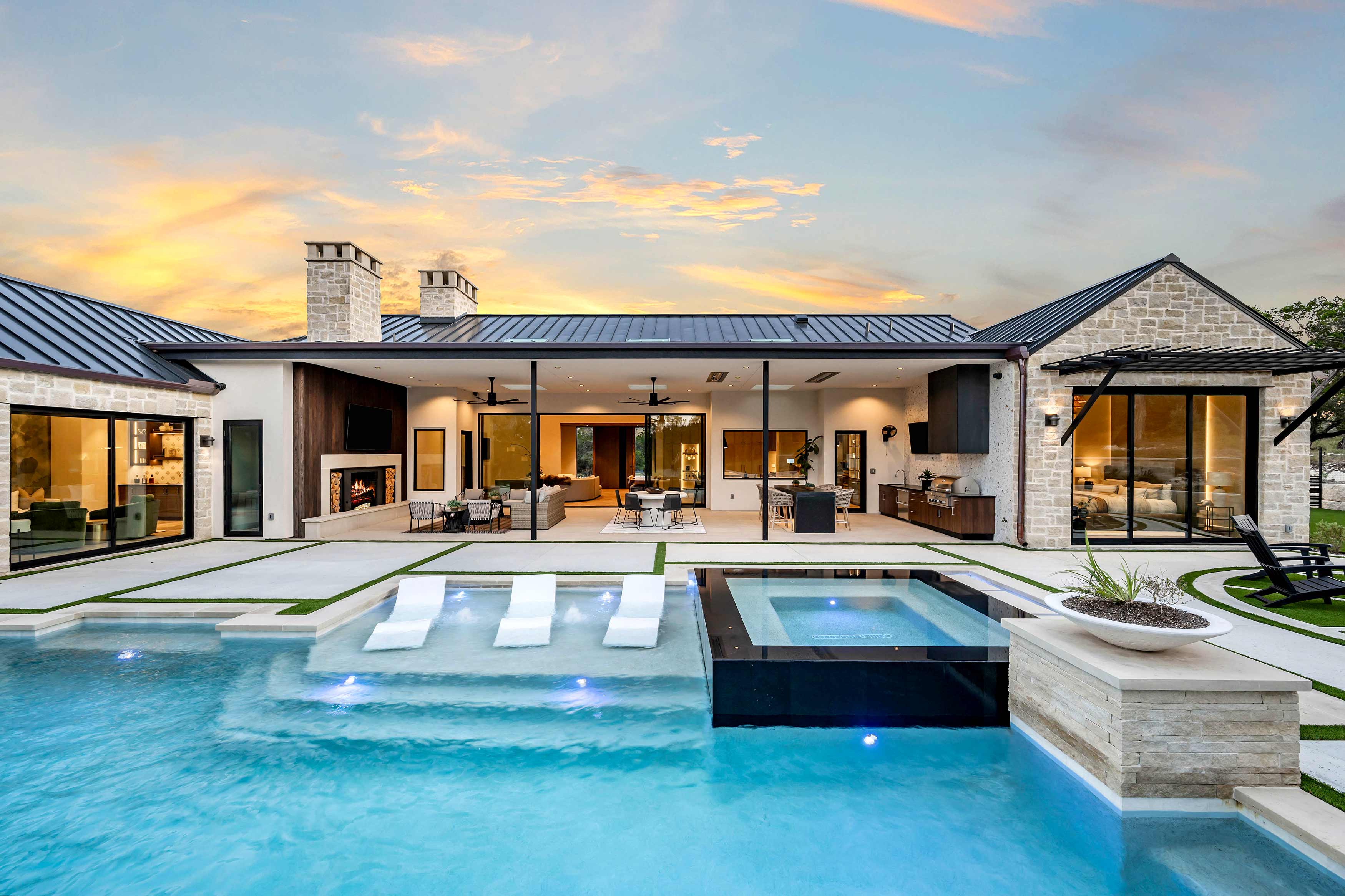 This custom Hill Country Modern home showcases modern elegance with organic warmth, defined by thoughtful craftsmanship and hidden functionality. Vaulted and coffered ceilings, integrated LED lighting and rich oak floors create a seamless flow through spaces designed for everyday comfort and sophisticated entertaining. Warm mushroom-toned cabinetry, hemlock planked ceilings and layered textures bring a sense of calm while sculptural light fixtures and contemporary finishes introduce a refined edge.
