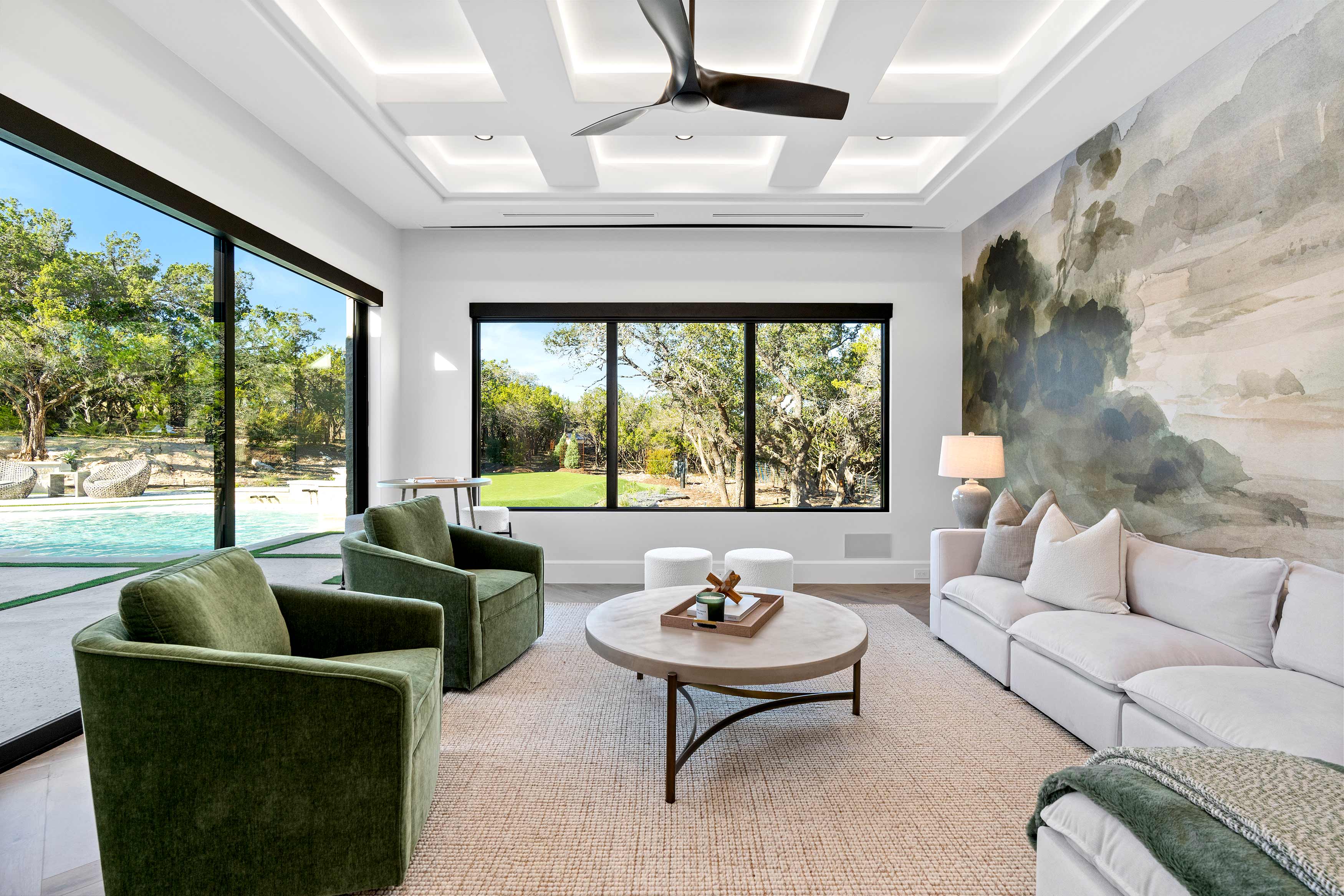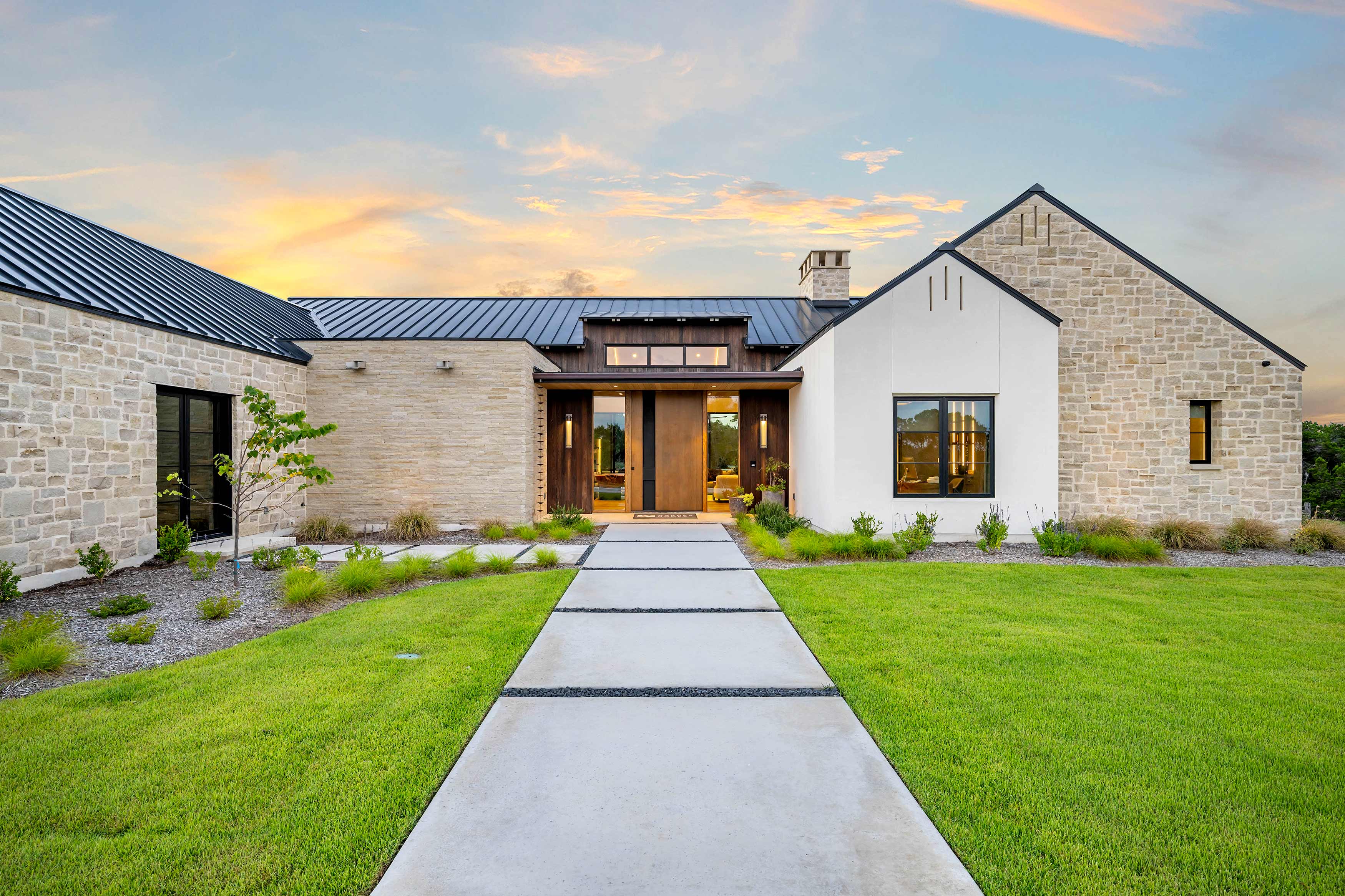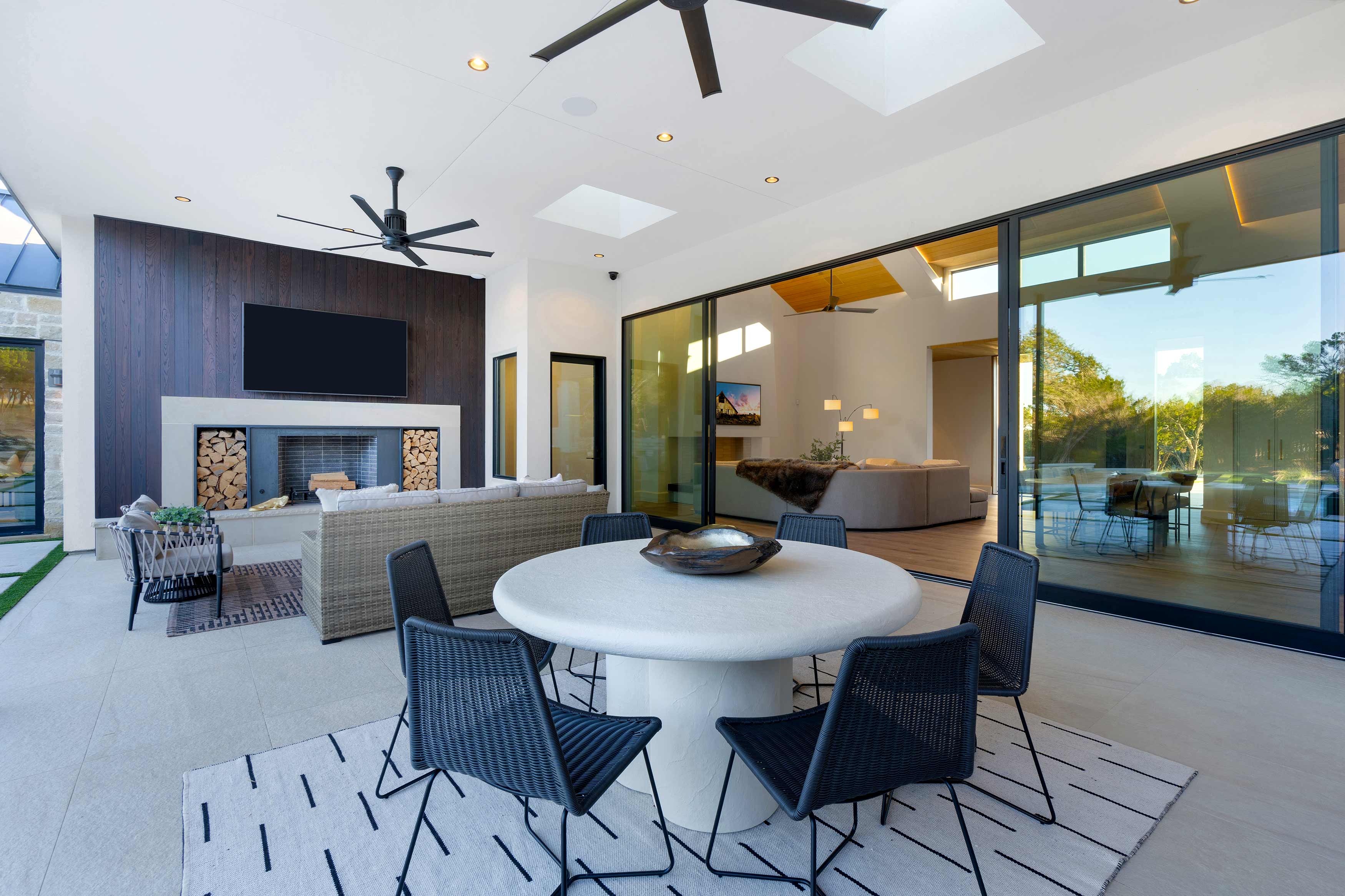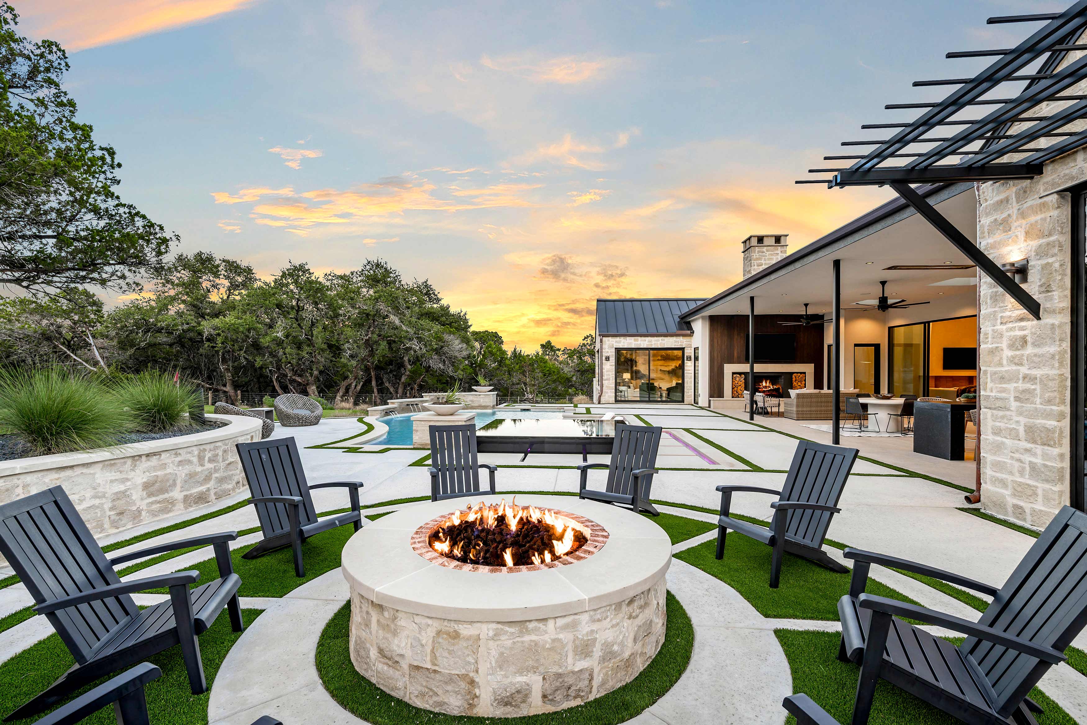 This custom Hill Country Modern home showcases modern elegance with organic warmth, defined by thoughtful craftsmanship and hidden functionality. Vaulted and coffered ceilings, integrated LED lighting and rich oak floors create a seamless flow through spaces designed for everyday comfort and sophisticated entertaining. Warm mushroom-toned cabinetry, hemlock planked ceilings and layered textures bring a sense of calm while sculptural light fixtures and contemporary finishes introduce a refined edge.