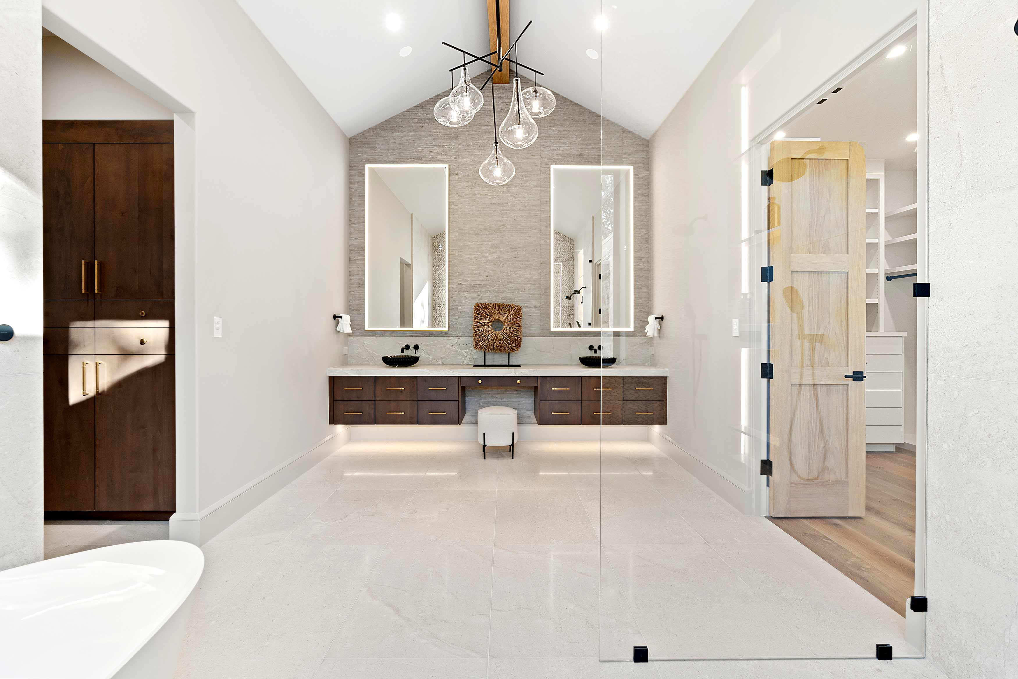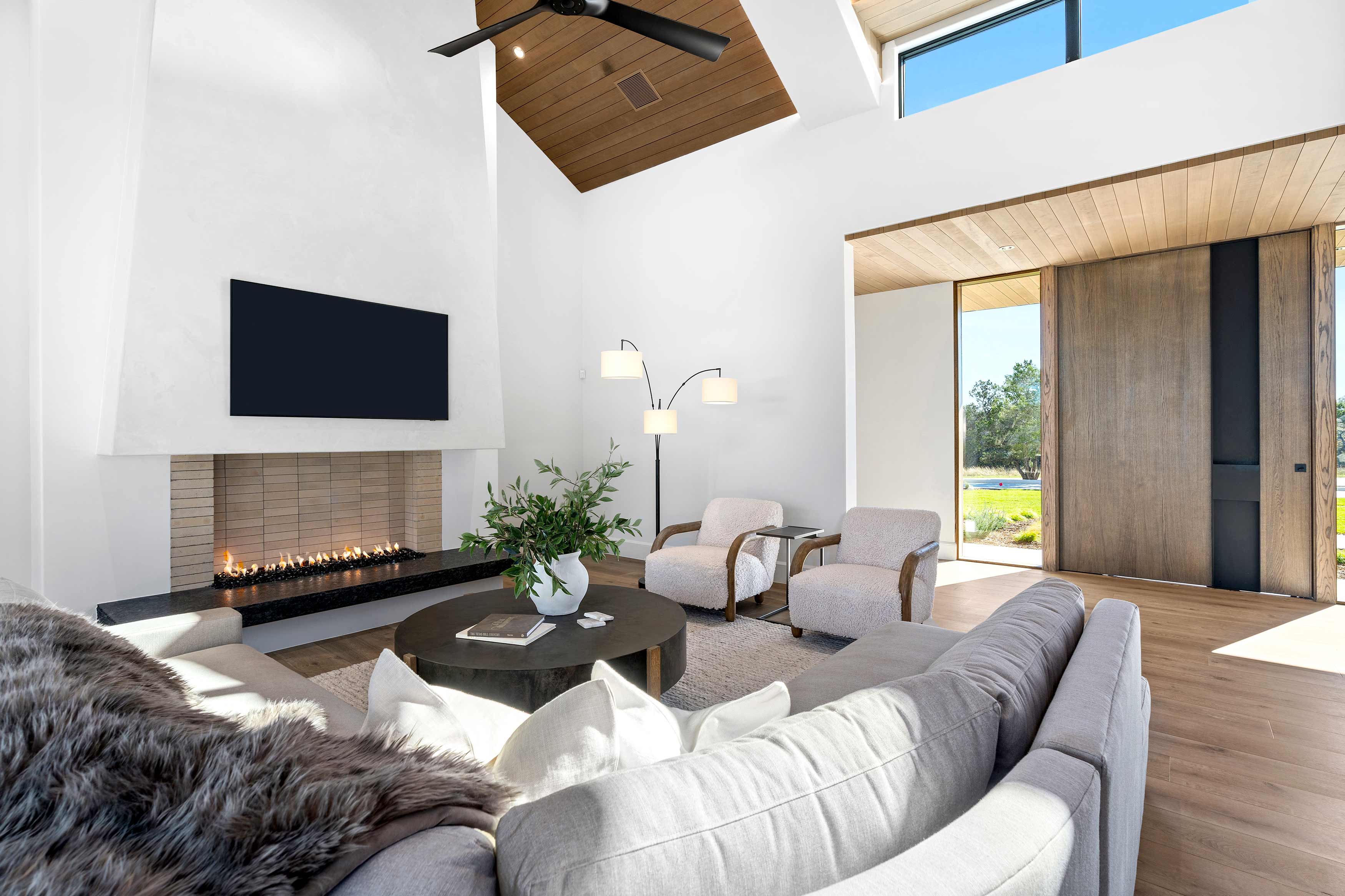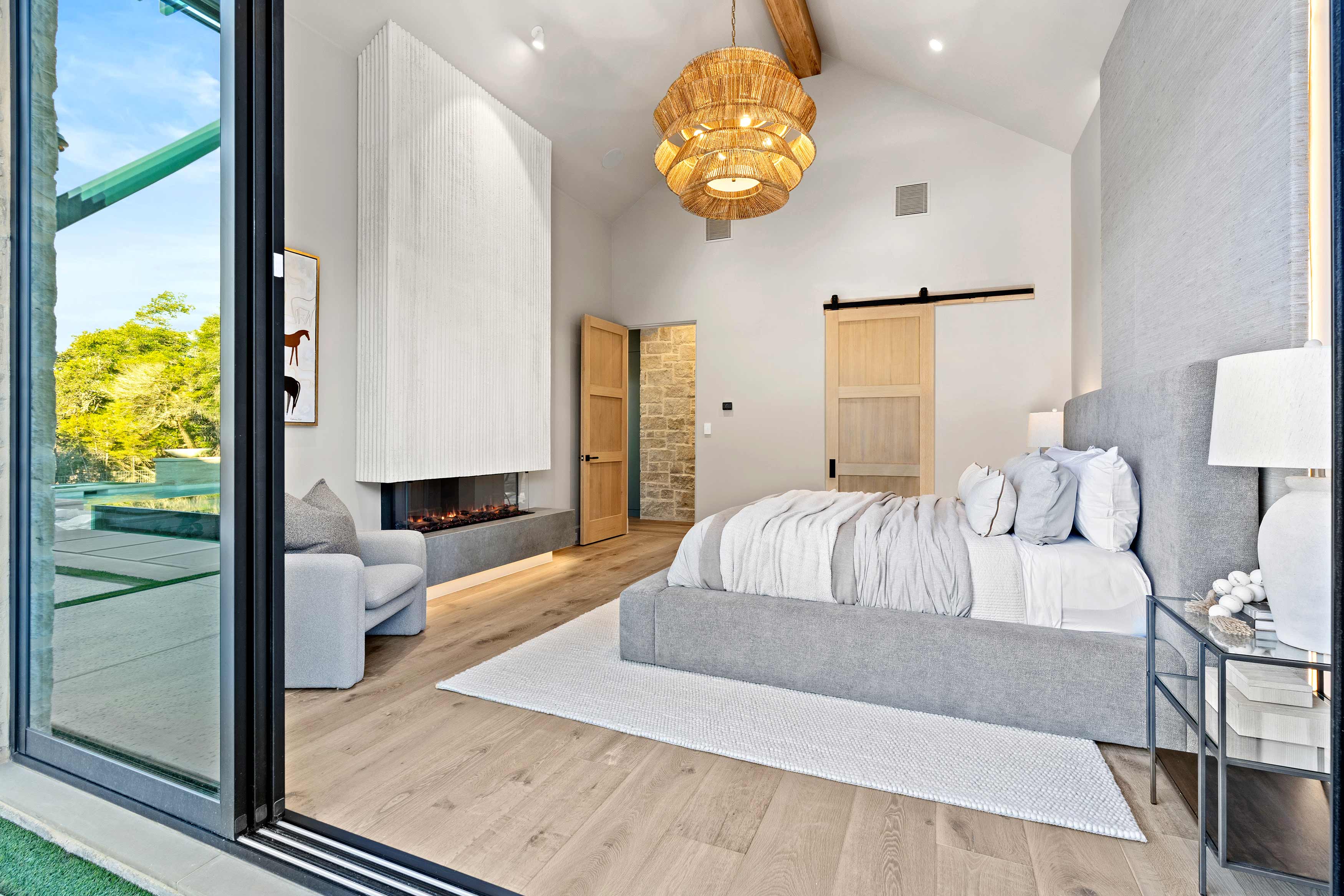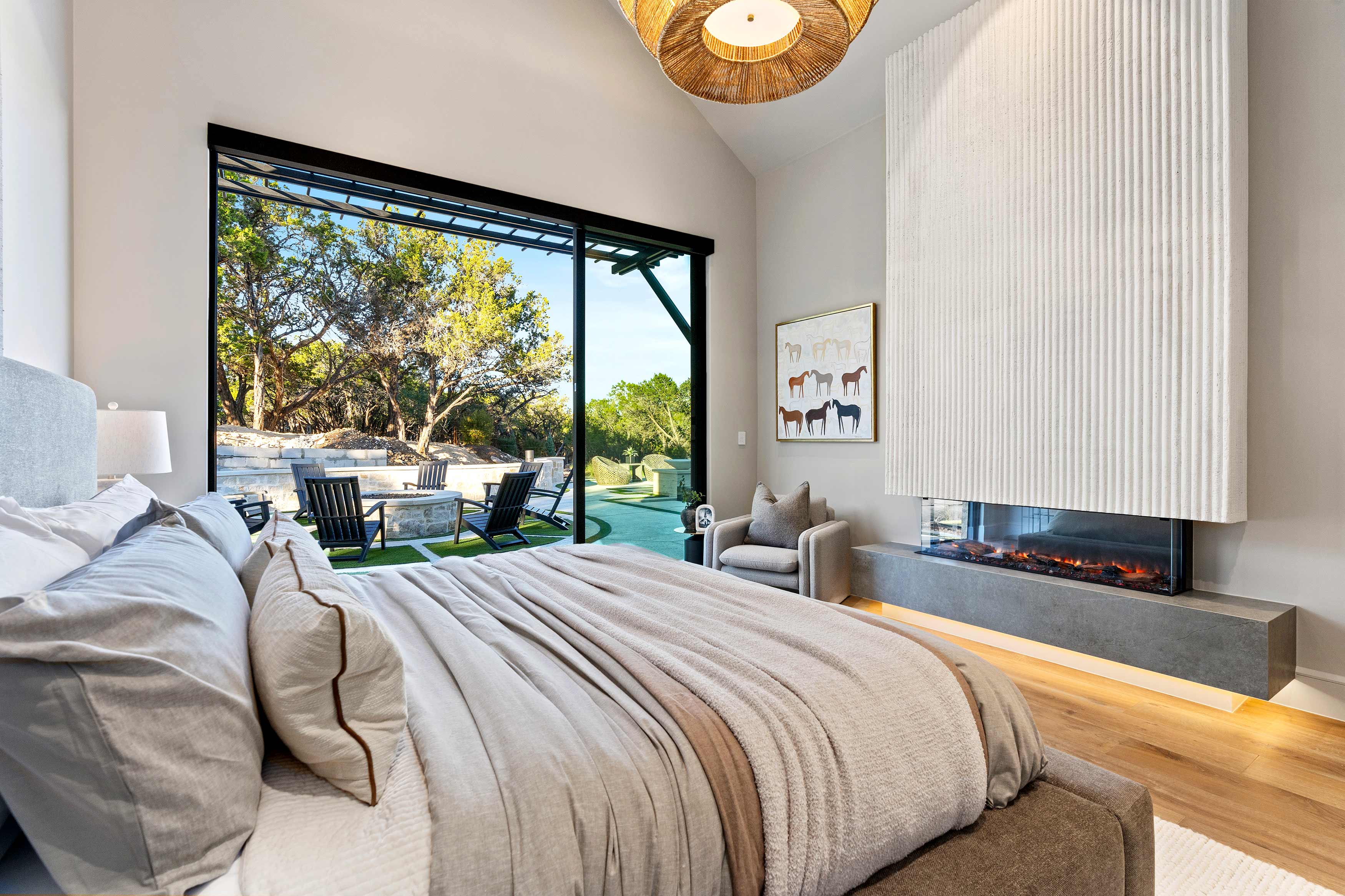 The owner’s suite serves as a peaceful retreat with a vaulted ceiling accented by a white oak ridge beam and a cascading abaca chandelier. A fluted plaster three-sided fireplace, backlit seagrass wall and multi-slide doors leading to a private firepit area create a spa-like atmosphere. The bathroom features Desert Cream limestone, a freestanding tub and a zen-inspired outdoor water feature visible from the wet room.