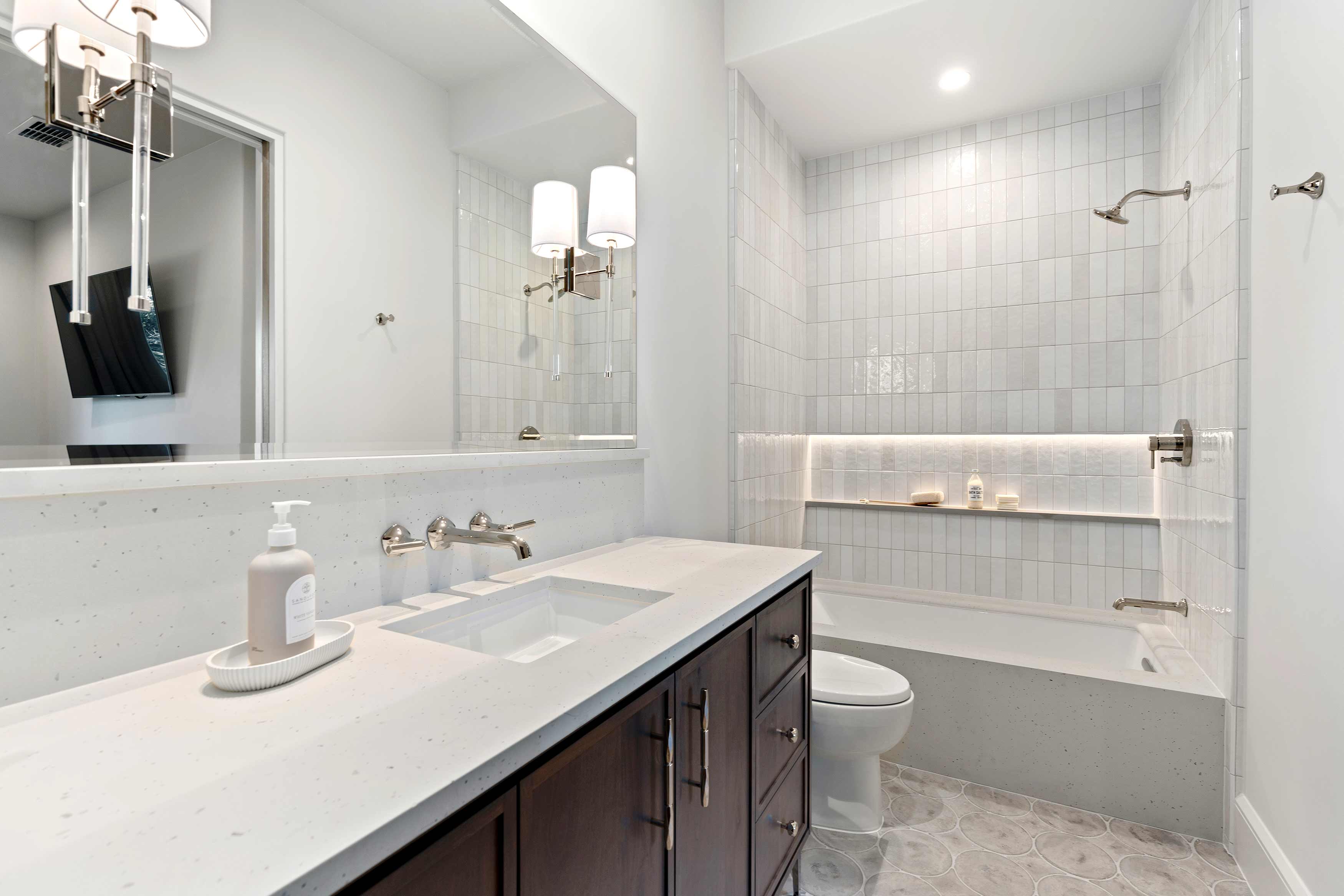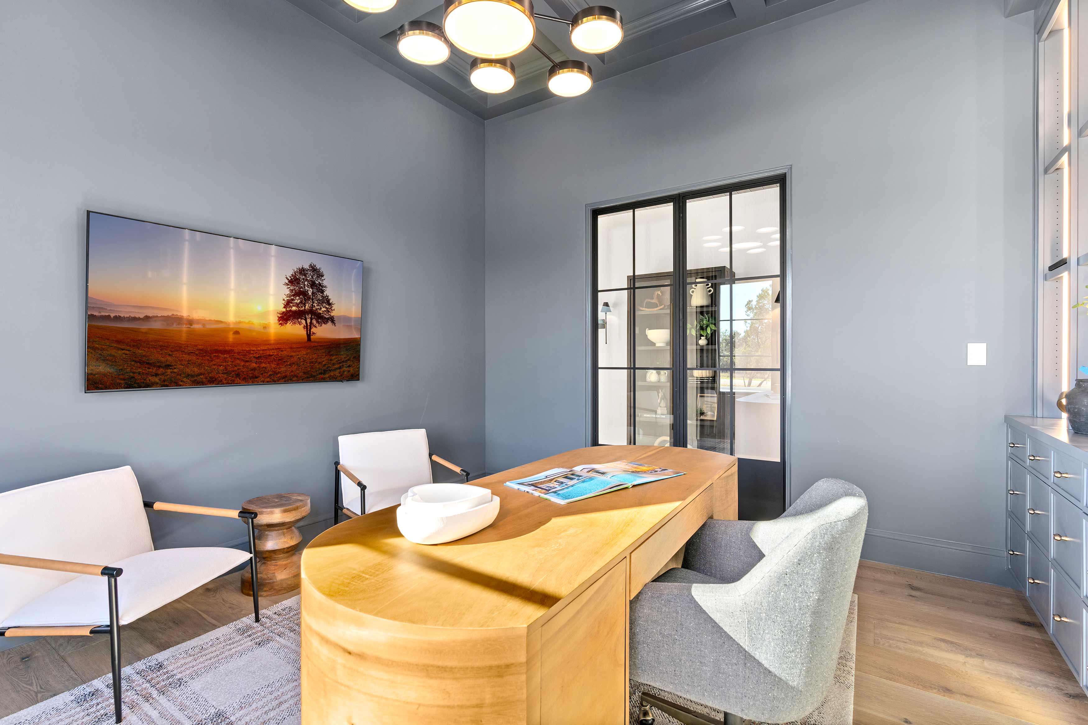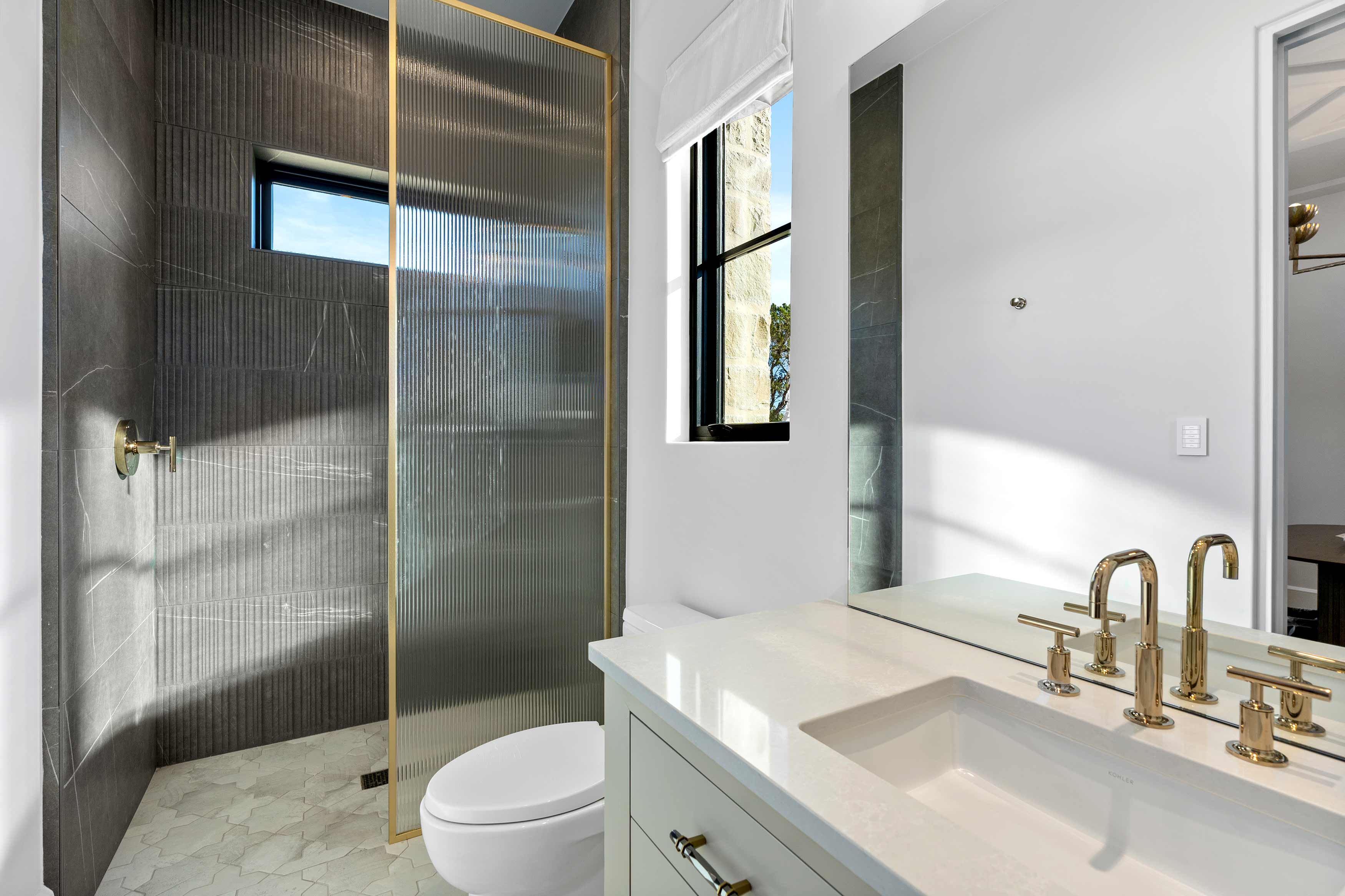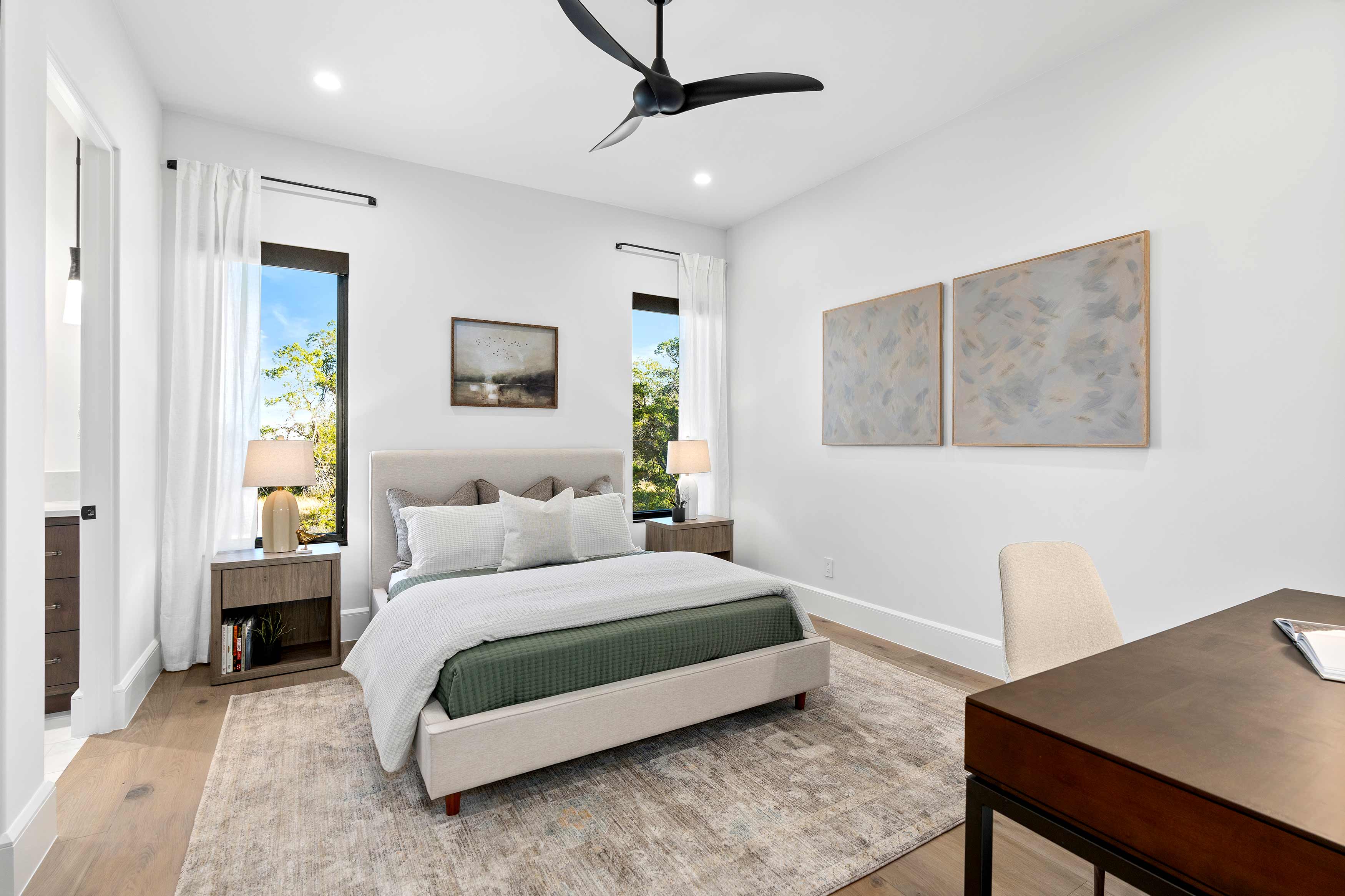 The owner’s suite serves as a peaceful retreat with a vaulted ceiling accented by a white oak ridge beam and a cascading abaca chandelier. A fluted plaster three-sided fireplace, backlit seagrass wall and multi-slide doors leading to a private firepit area create a spa-like atmosphere. The bathroom features Desert Cream limestone, a freestanding tub and a zen-inspired outdoor water feature visible from the wet room.