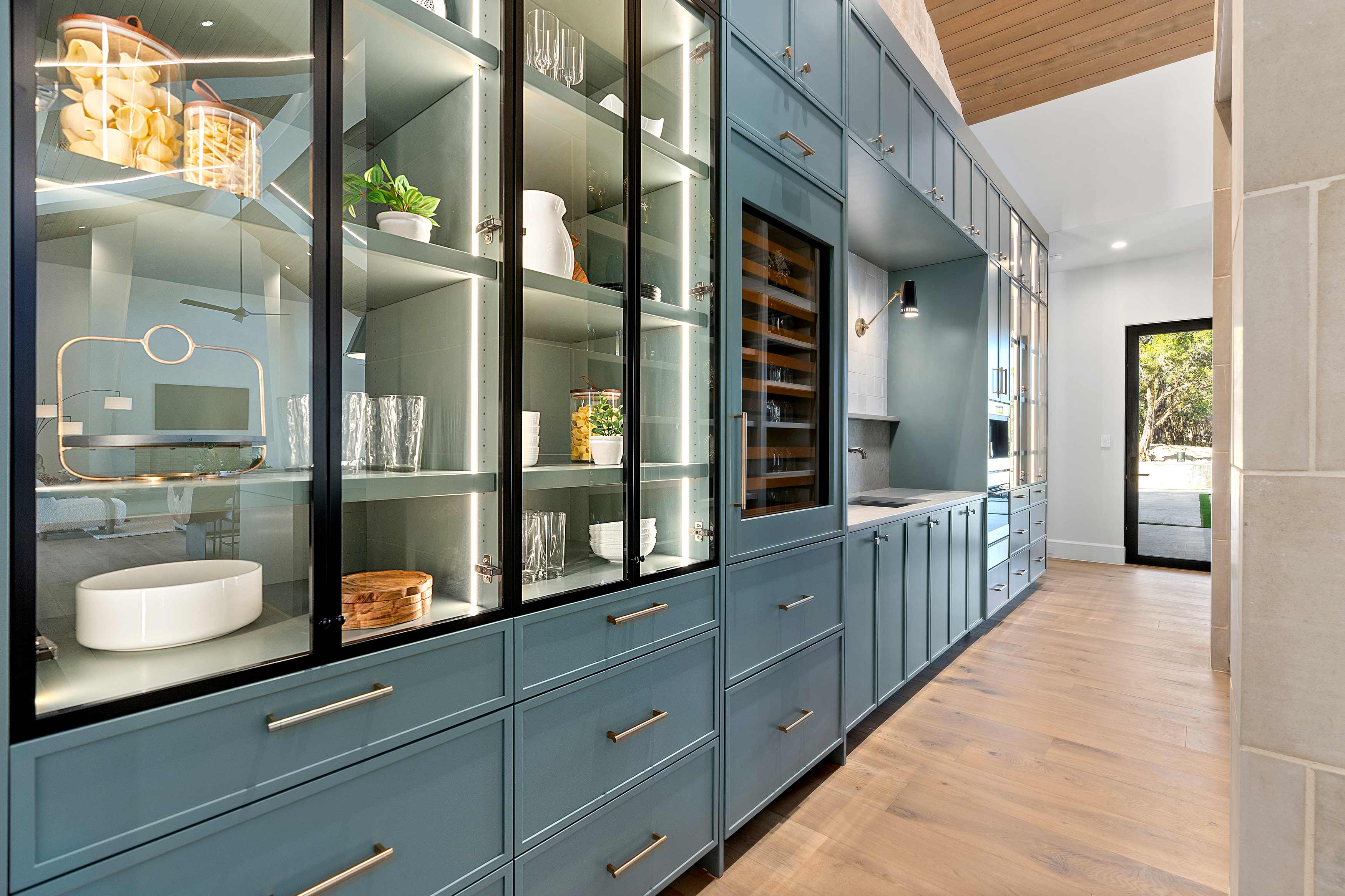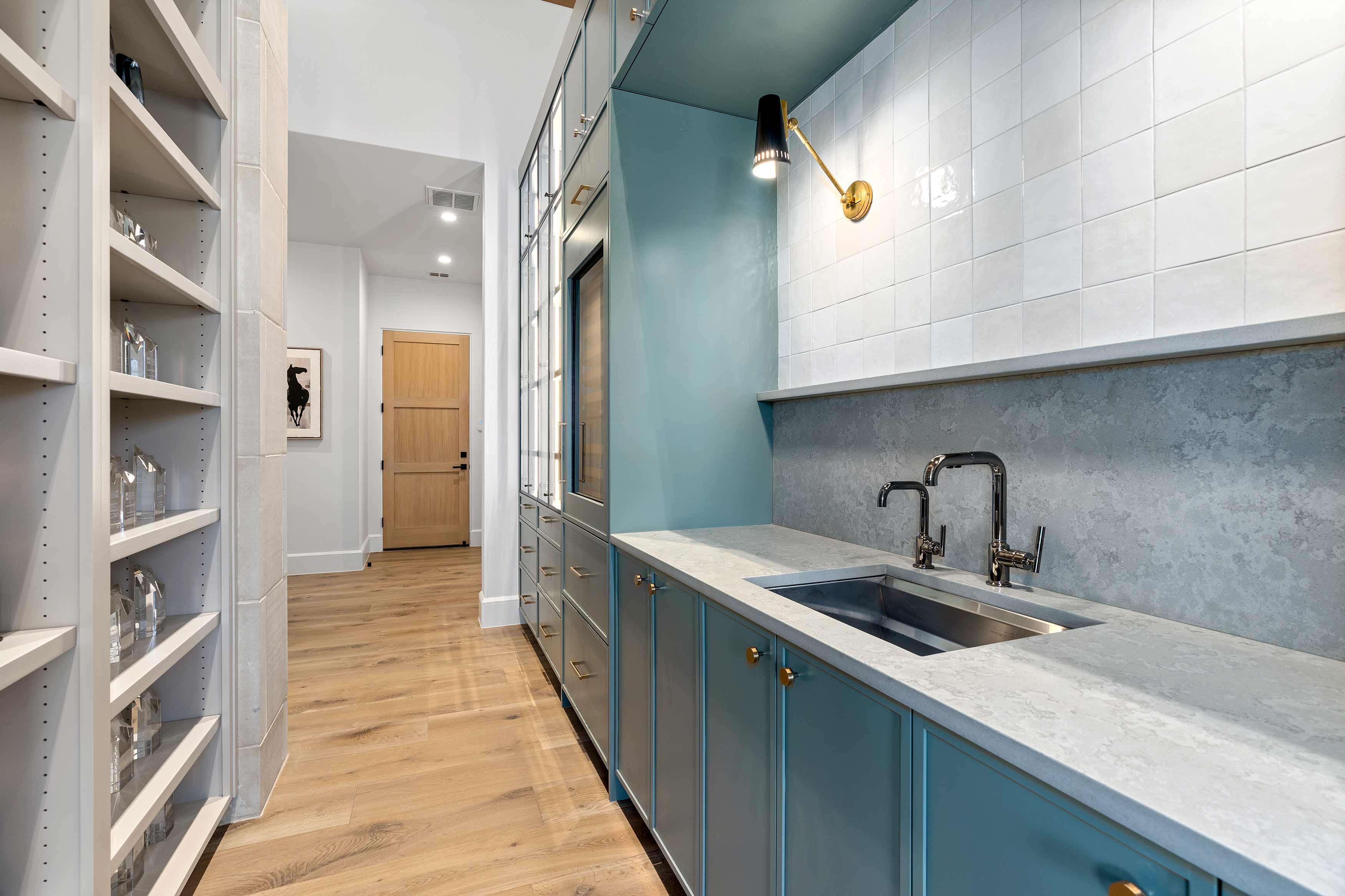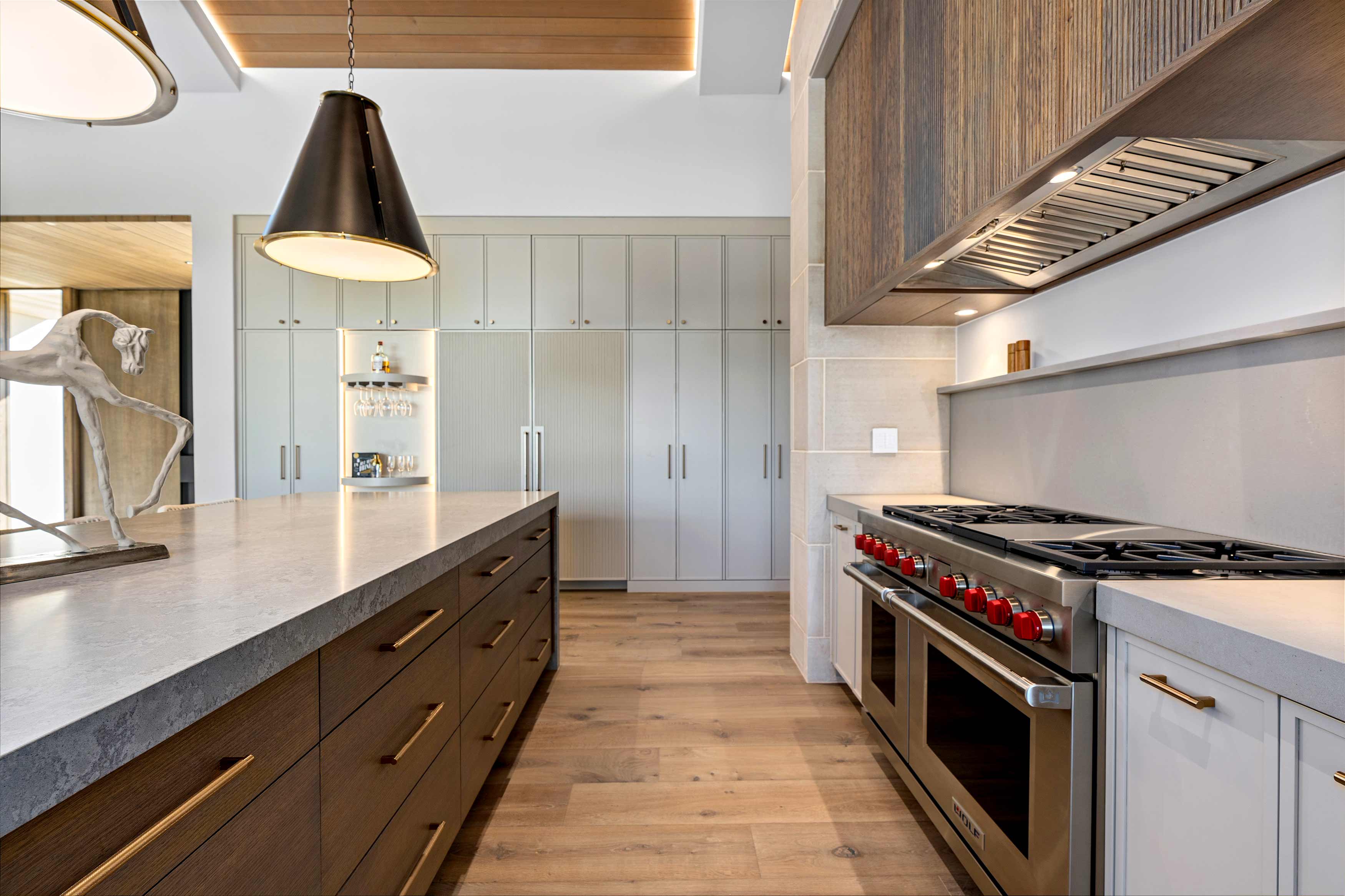 At the heart of the home, the kitchen features a 12-foot rift-sawn white oak island with a Vicostone Concrete waterfall-edge countertop surrounded by soft mushroom perimeter cabinets topped with Caesarstone Clear Skies quartz. A 48-inch Wolf range sits within buff Lueders stone framed by a reeded white oak hood concealing a motorized drop-down spice rack. The hidden rotating bar and walk-through pantry complete with additional Wolf appliances, LED shelving and Element metal-and-glass doors elevate convenience and style.