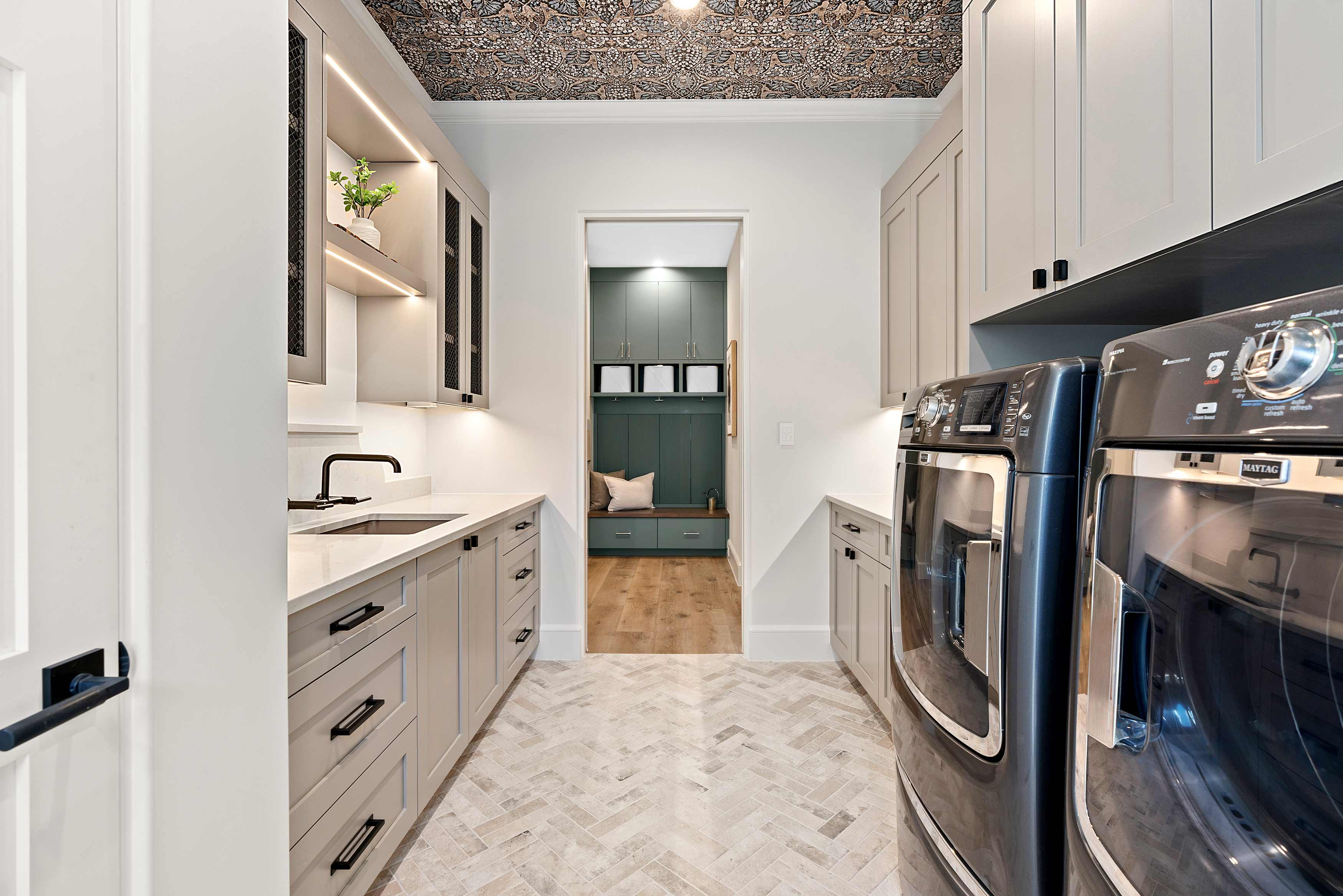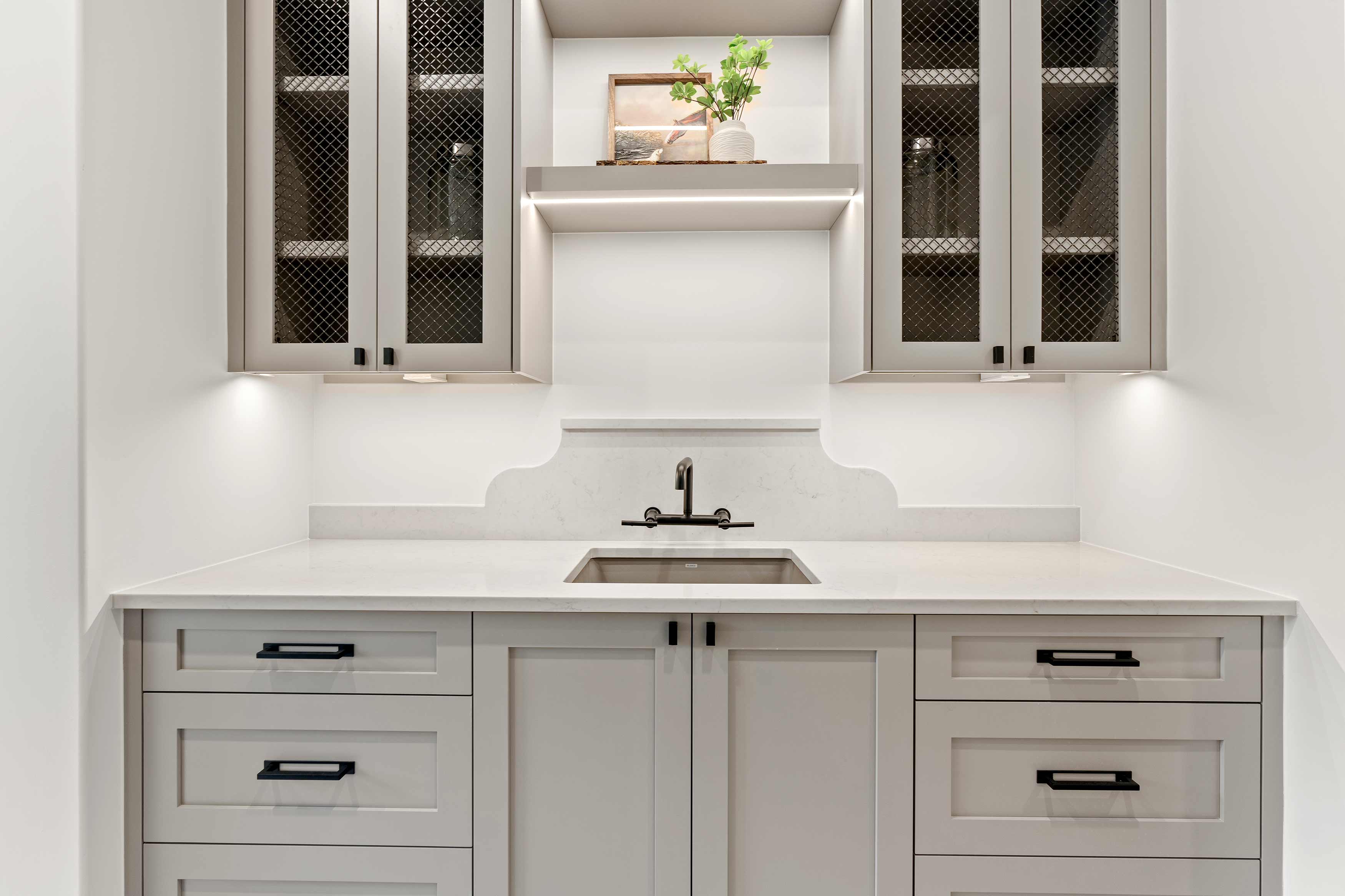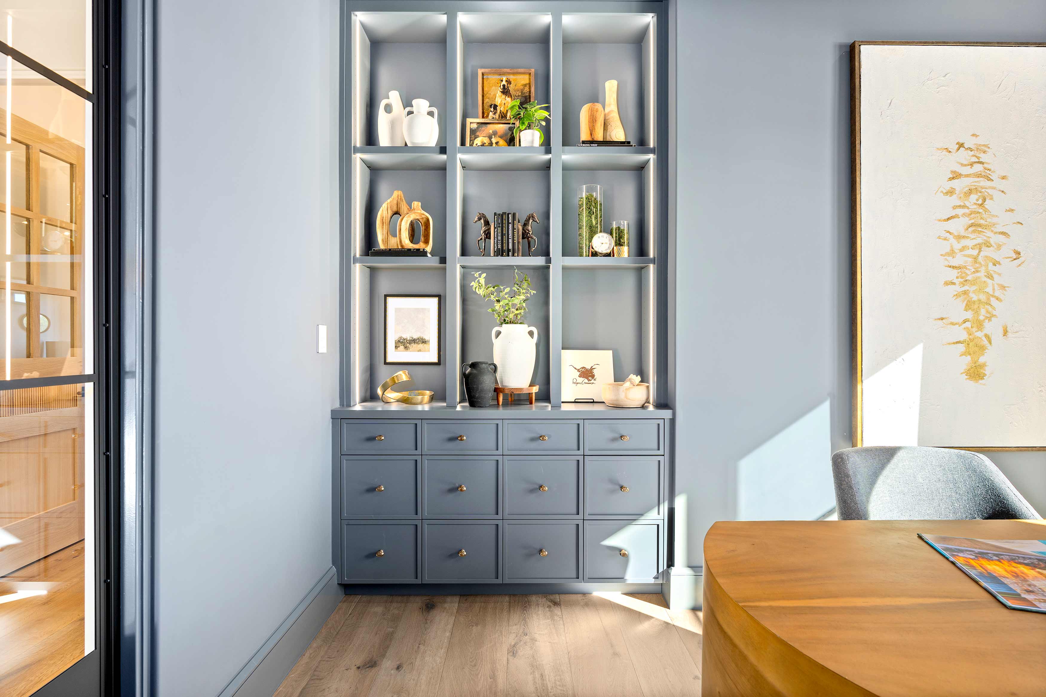 At the heart of the home, the kitchen features a 12-foot rift-sawn white oak island with a Vicostone Concrete waterfall-edge countertop surrounded by soft mushroom perimeter cabinets topped with Caesarstone Clear Skies quartz. A 48-inch Wolf range sits within buff Lueders stone framed by a reeded white oak hood concealing a motorized drop-down spice rack. The hidden rotating bar and walk-through pantry complete with additional Wolf appliances, LED shelving and Element metal-and-glass doors elevate convenience and style.