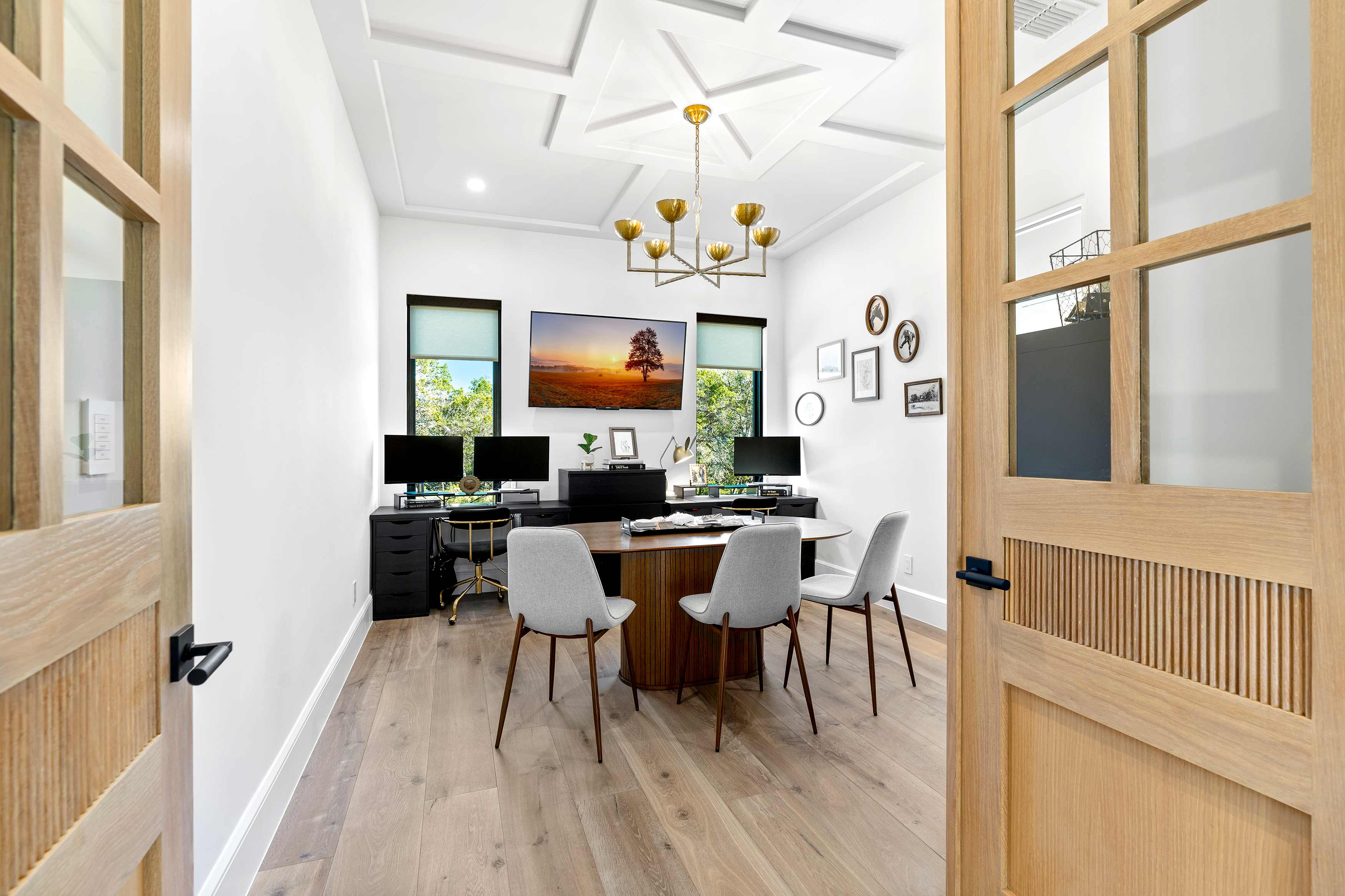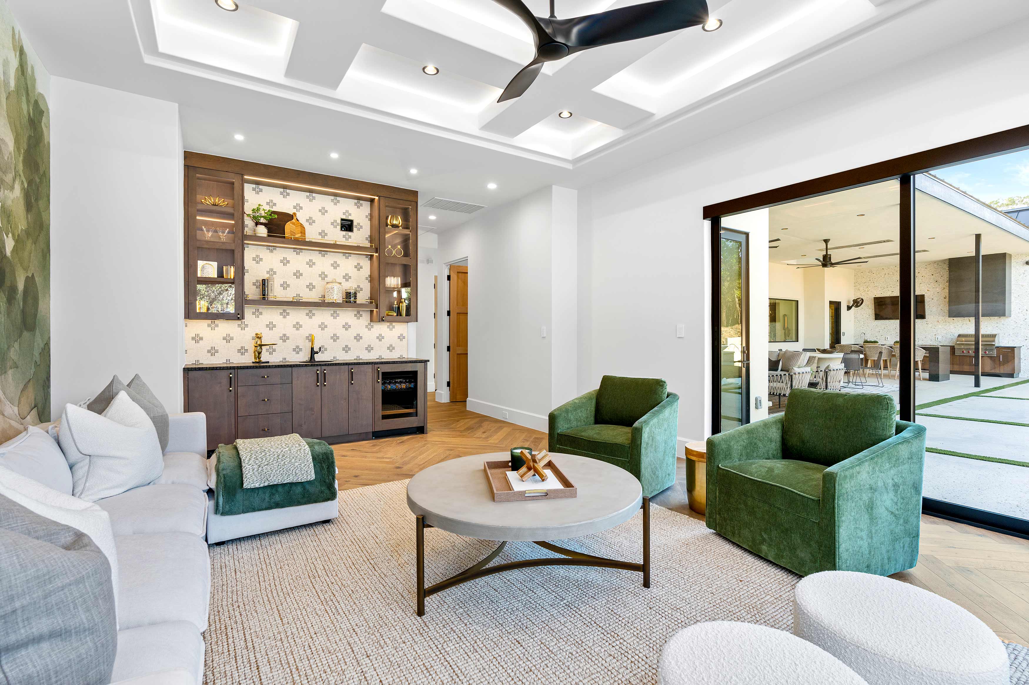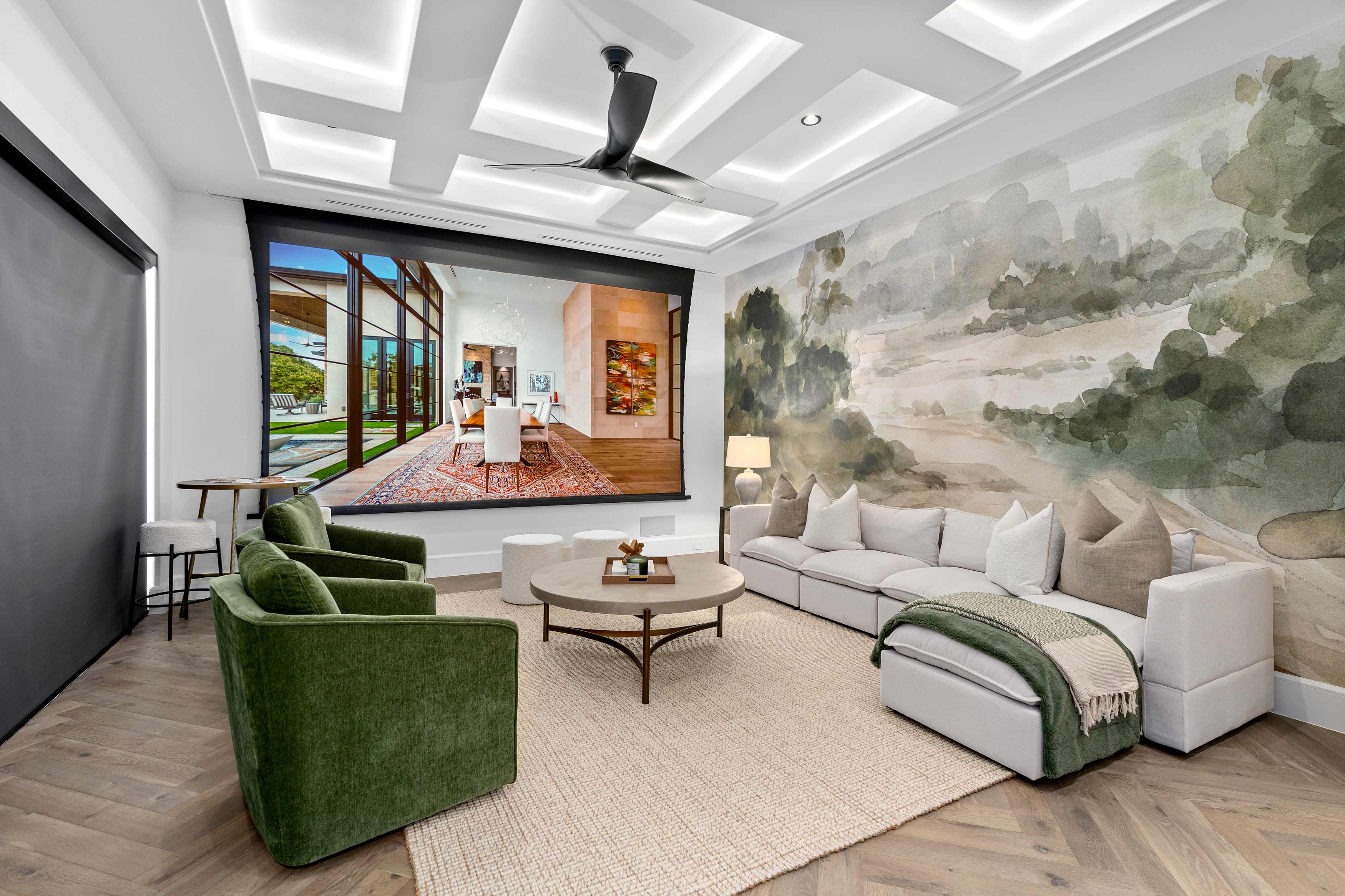 The media room blends style and versatility with herringbone white oak floors, a scenic mural wall and a full wet bar featuring clear alder cabinetry, brass accents and a fluted-edge countertop. Automated blackout shades, a drop-down 160-inch screen and direct pool access transform the room from cozy retreat to home theater.
