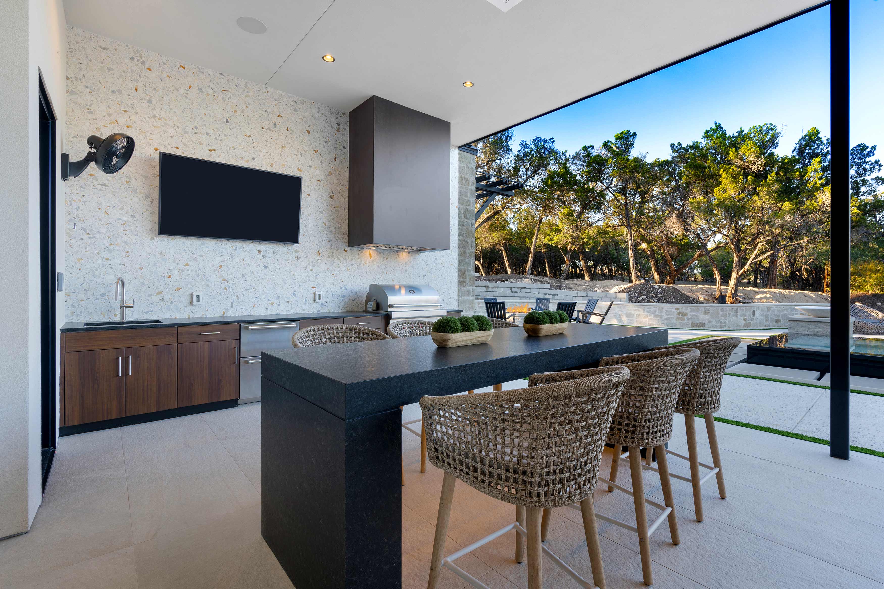 Black Pearl leathered countertops with waterfall panels in outdoor kitchen